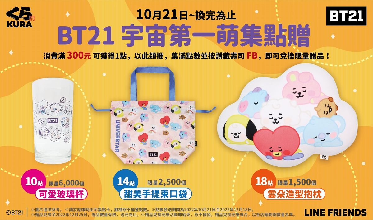 今年秋天,超人氣明星們將化身於各式萌度滿分的小物等你來兌換, 7位明星包含KOYA、RJ、SHOOKY、MANG、CHIMMY 、TATA 及COOKY,共同以俏皮之姿躍上實用好物中,為民眾增添生活的樂趣,超萌好禮包含實用的可愛玻璃杯、繽紛甜美的手提束口袋及柔軟的雲朵造型抱枕,邀請大小朋友一起營造愜意的日常時光。 自10月21日起,民眾凡消費滿300元即可獲得一點,並完成按讚藏壽司Facebook至櫃台出示畫面,集滿10點即可兌換可愛玻璃杯一個,集滿14點即可兌換甜美手提束口袋,集滿18點即可兌換療癒雲朵造型抱枕。點數將於10月21日至12月18日發放,贈品兌換期限為至12月25日,數量有限,兌完為止,粉絲們趕緊前往藏壽司收集限量好禮吧!