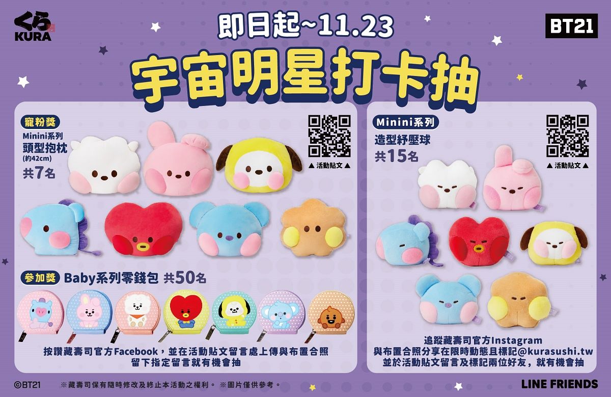 BT21明星們除了將於三間藏壽司限定BT21特色店Q萌登場,藏壽司更推出雙重社群活動邀請所有藏友們來參加,自10月21日至11月23日,民眾只要按讚藏壽司官方Facebook,再於藏壽司官方Facebook指定活動貼文按讚,並留言分享特色店任一擺設的照片.即有機會將 BT21 頭型抱枕或BT21 零錢包納入手中。另一方面,只要公開分享與藏壽司BT21特色店俏皮合照至Instagram限時動態中,標記藏壽司官方帳號,並於活動貼文底下留言及標記兩位好友,即有機會獲得迷你舒壓球,共有7款人氣明星化身慵懶造型等民眾抽回家。多款限量BT21小物,等不及療癒所有粉絲們,詳細活動資訊請參考藏壽司官方Facebook及Instagram活動貼文,民眾趕緊記下日期,前往藏壽司體驗被宇宙明星包圍的療癒時光!