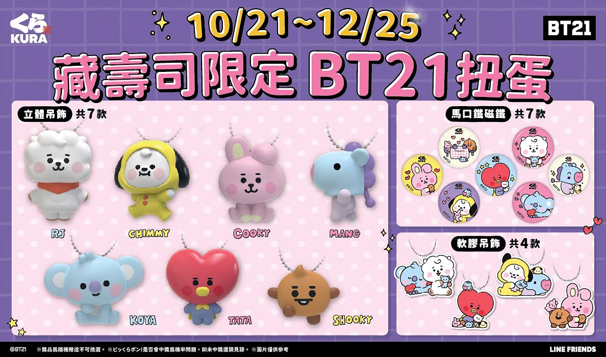 守護宇宙的BT21強勢登場!各自擁有不同迷人魅力的超萌明星們首度現身藏壽司。藏壽司店鋪將從10月21日起至12月25日推出共計18款BT21 My Little Buddy系列限定扭蛋,與藏友們一起踏上開心的美食之旅。18款限定扭蛋中,分別包含7款立體吊飾、7款馬口鐵磁鐵以及4款軟膠吊飾,而本次的限定扭蛋中更是隱藏著滿滿精心打造的細節等民眾來發現。首先,7款立體吊飾分別由溫柔的RJ用其蓬鬆的造型為大家帶來療癒時光、小睡蟲KOYA難得睜開超萌雙眼邀請大家進入他多才多藝的世界、超級熱情的CHIMMY等不及帶給大家滿滿的愛、充滿好奇心的 TATA迫不及待與民眾一起探索世界、俏皮的COOKY等大家一同前來玩樂、調皮愛搗蛋的SHOOKY與帥氣愛跳舞的MANG,多款人氣明星搶先登場與大家共度用餐時刻。還有7款生動的馬口鐵磁鐵,包含RJ將KOYA擁入懷中、COOKY深情注視SHOOKY 、TATA把RJ捧在手心以及CHIMMY與MANG攜手玩樂等多款造型,多款萌度爆表的扭蛋即將帶來蒐藏熱潮。另一方面,還有4款萌翻天的軟膠吊飾也是大家不容錯過的療癒小物,多款人氣主角們的可愛造型,邀請民眾前來收藏。多款療癒造型扭蛋限時出現於藏壽司,BT21粉絲們趕緊記下日期,邀請好友們一起前往體驗藏壽司體驗歡樂又逗趣的用餐時光!
