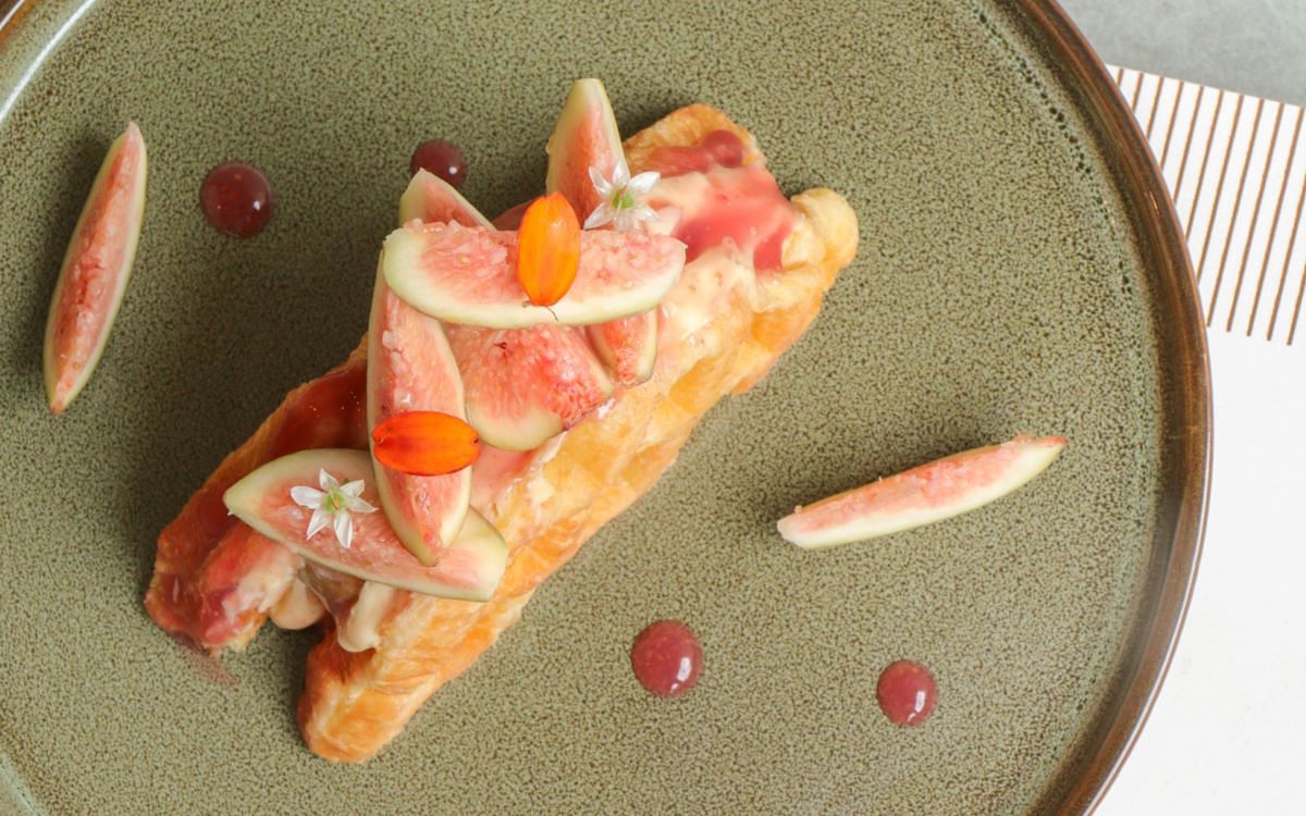 由曾赴巴黎學藝的正統法式甜點師親自操刀研發每季甜點,將法式層次與視覺饗宴的靈魂帶入常見的甜點中,以秋冬限定的無花果為主角,設計出這款澎派無花果可頌鬆餅,不計成本使用整顆無花果,切片分布於夾層及擺盤中,內餡交織香草卡士達與覆盆子無花果醬,酸甜綿密的口感融合於舌尖,混入無花果清新的香氣,感受到最新鮮口感滋味!