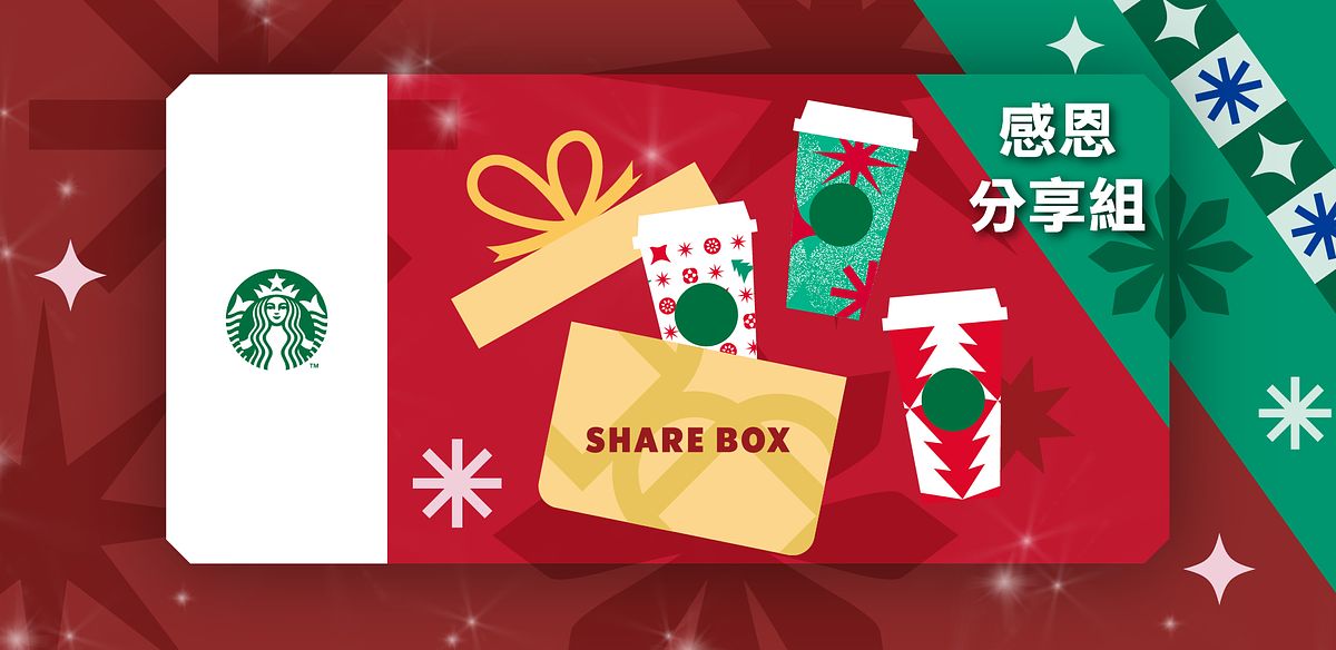 迎接團聚冬日,星巴克LINE官方帳號於11月2日起推出期間限定販售「THANKSGIVING SHARE BOX 感恩分享組」,方案14杯可享優惠72折起,內含150元電子飲料券(10張)及175元指定耶誕新品飲料體驗券(4張),於訂購後(含)30天內可於超過500間實體門市兌換,購買後可單券轉贈多人分享,邀請顧客一起分享溫暖分享愛!