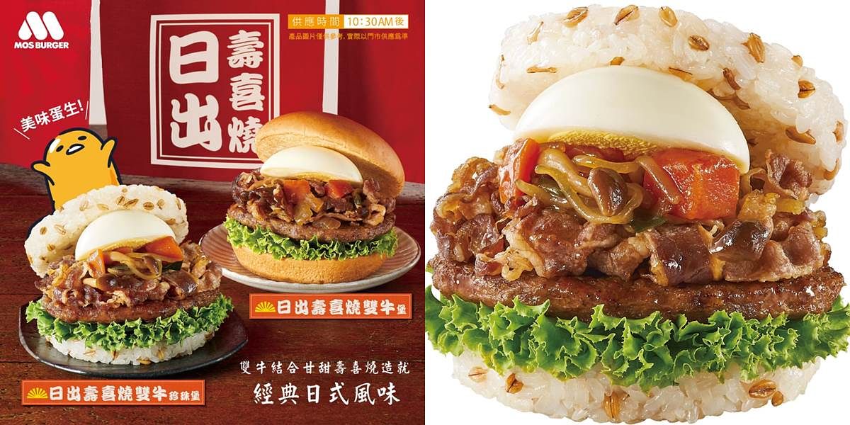 濃濃日式風味的「日出壽喜燒雙牛珍珠堡」售價115元,採用洋蔥、紅蘿蔔、鴻喜菇、青蔥、蒟蒻…等食材拌炒,再加入柴魚昆布高湯與醬油為基底特製的日式壽喜燒醬調味,並以摩斯經典燒肉片與多汁牛肉排,搭配水煮蛋及青生菜,層層堆疊在熱騰騰的超級大麥米飯上,增添豐富口感層次,想品嚐道地日式壽喜燒風味米漢堡,絕對不能錯過這一款!喜歡牛肉及麵包的民眾另可選擇「日出壽喜燒雙牛堡」。「日出壽喜燒雙牛堡」售價105元,嚴選優質牛肉製成美味餡料,經鐵板高溫拌炒引出香味後,與壽喜燒時蔬、水煮蛋、及青生菜一起夾入漢堡麵包,入口細嚼、甘美肉汁在齒頰中奔騰,令人口齒留香。