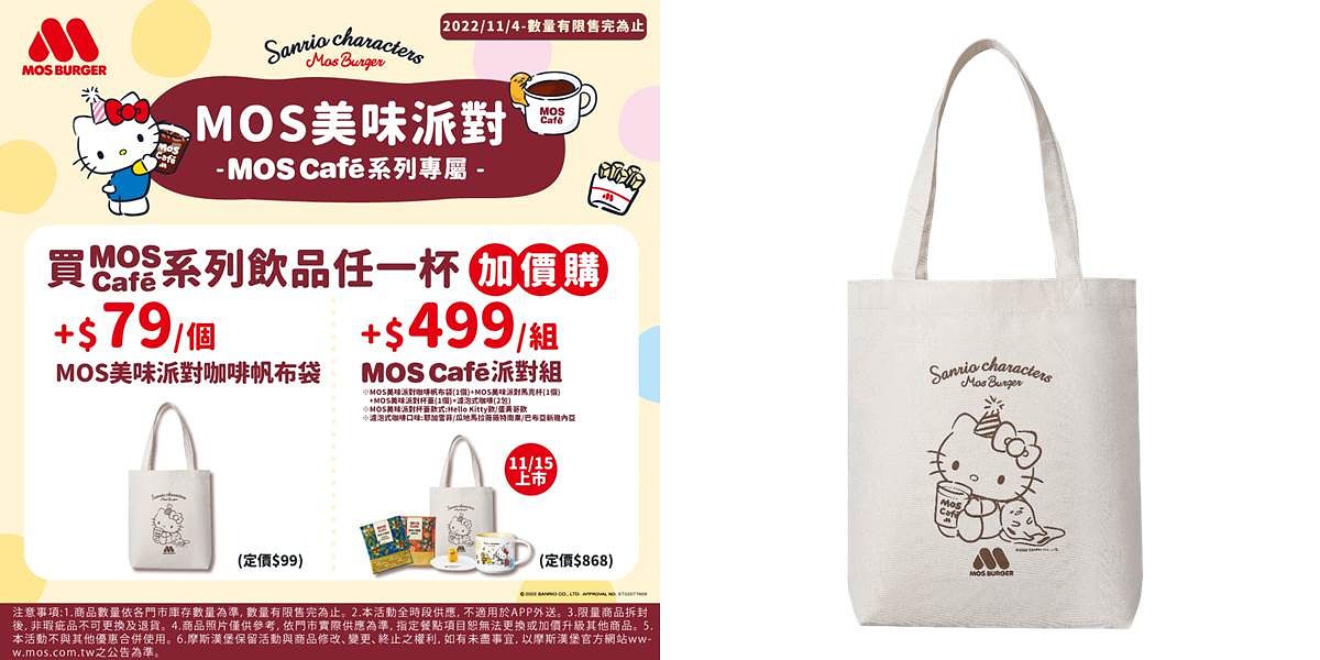 此外,搭配三麗鷗聯名活動,MOS Order App也同步推出「安心取溫馨送」搶先購優惠,11月1日至11月7日止,凡MOS會員於MOS Order App「安心取溫馨送」購買「蛋黃哥照燒嫩雞堡套餐」乙組,享優惠價111元;「日出壽喜燒雙牛珍珠堡及大杯冰紅茶」乙組,享優惠價119元;「椪糖雲朵拿鐵咖啡2杯」乙組,售價160元,再加贈MOS美味派對咖啡帆布袋1個,各項商品組合限量1,000組,售完為止!