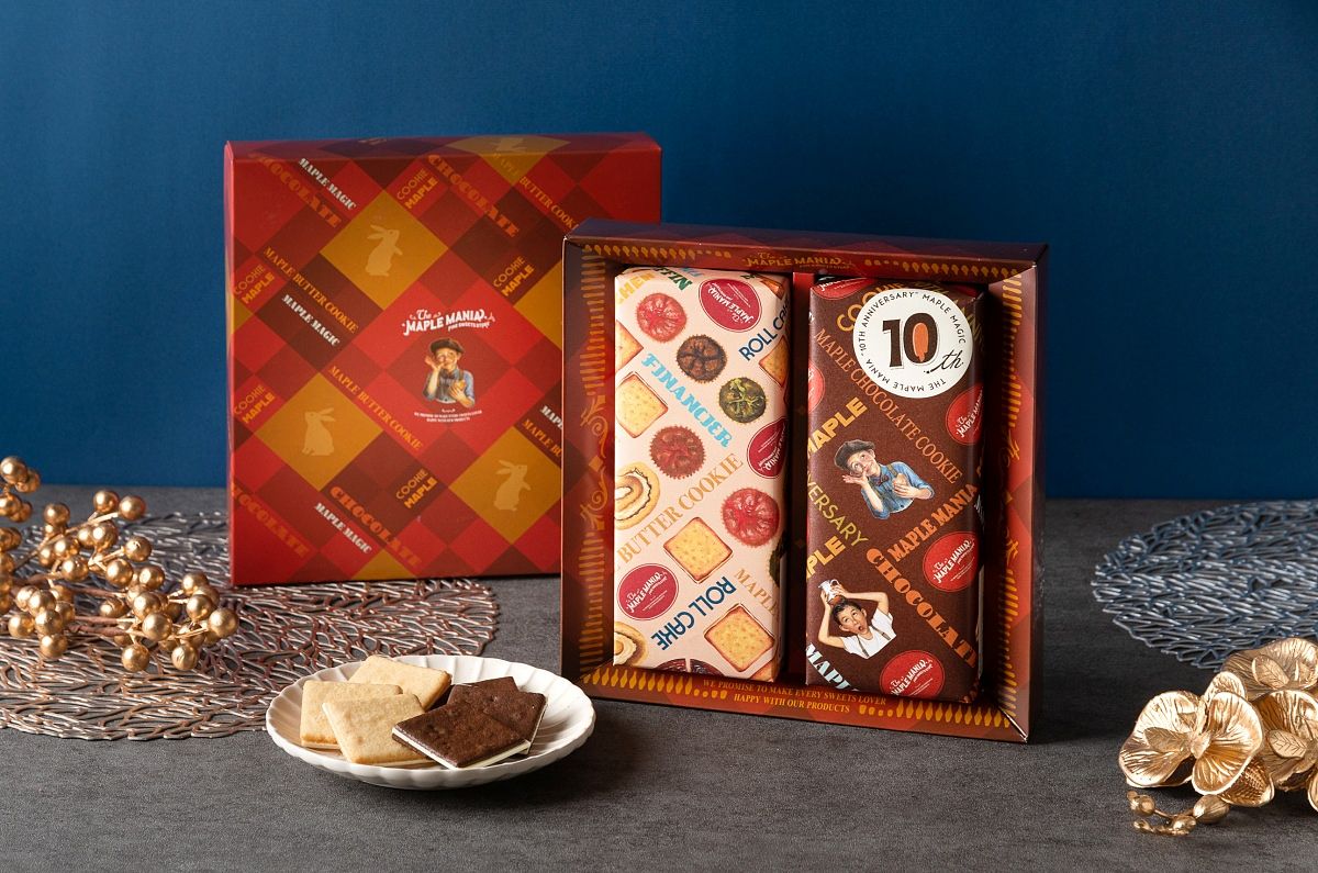 「The Maple Mania 楓糖男孩」推出4款迎兔新春禮盒,包括除推出台灣版限定包裝組合18入及28入3款禮盒之外,更首度引進歡慶品牌創立10周年、2022全球年度新品「楓糖巧克力夾心餅乾」。包裝設計上,以國人喜愛的年節吉祥圖素、俏皮喜兔及大紅色系等元素為設計主軸,改版推出新春禮盒限定款。商品口味揀選除集結保有鐵粉最愛品項「楓糖奶油夾心餅乾」及「楓糖費南雪」鎮店招牌之外,同時更將首次在台發售「楓糖巧克力夾心餅乾」納入!