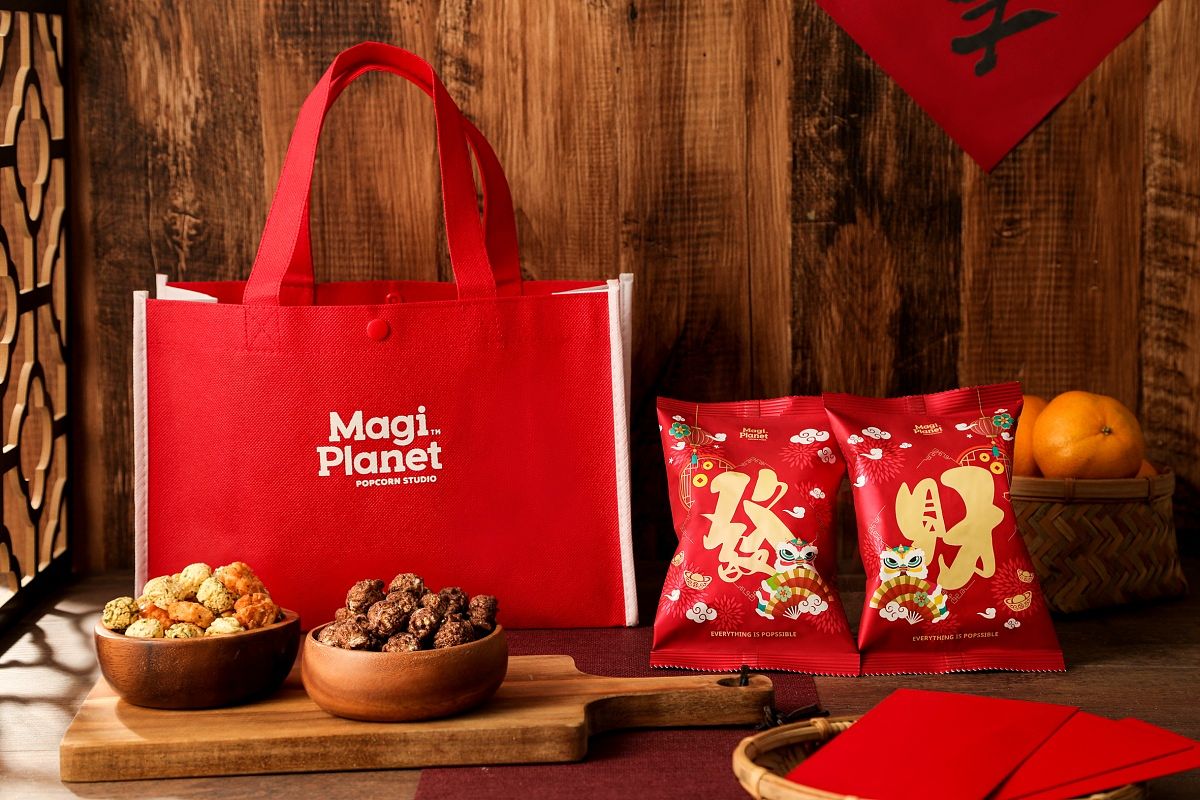 Magi Planet 星球工坊設計時尚獨特禮盒,採用大紅色作為外包裝主色展現新年氣息,以金色壓紋與線條 勾勒出輕奢氛圍,搭配多種經典口味爆米花,從玉米濃湯爆米花到雙色地瓜米薯條,各種豐富組合任選。