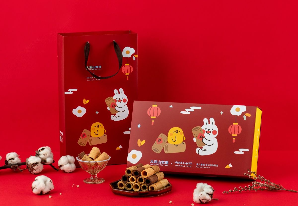 「大武山牧場」搭檔超人氣插畫家「懶散兔&啾先生」推出「雞兔伴你過好年」春節聯名企劃,從鮮蛋到蛋捲一次網羅,不僅有超萌的雞蛋包裝,還有必收藏的蛋入蛋捲兔年經典禮盒。內含經典原味、紅玉紅茶以及法式可可,三種熱門口味一次滿足蛋捲控的味蕾。