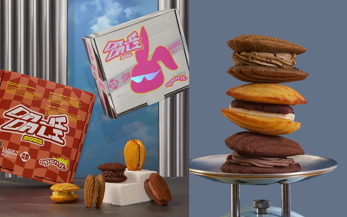 瑪德蓮專門品牌open it.,以獨到的口味設計顛覆法式經典瑪德蓮,這次的兔年限定禮盒以未來感十足的宇宙銀搭配桃花科技,一口氣推出兩款潮流設計包裝。搭配兔年限定口味瑪德堡:用法國沙巴東無糖栗子泥配上法芙娜可可豆製成的「吉栗可可」,以及嚴選南投蜜香紅茶與桂花布蕾內餡的「富桂蜜香」。