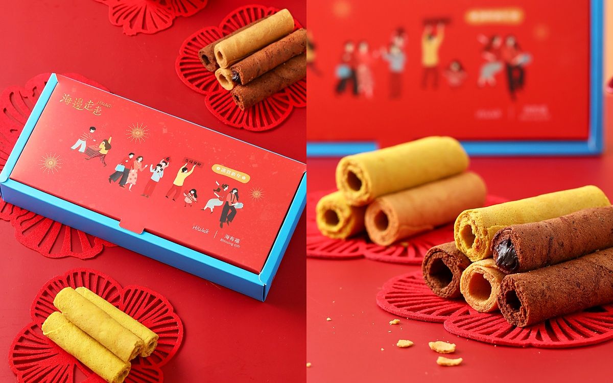 海邊走走春節禮盒共推出三種選擇,特別推薦「海有福綜合蛋捲禮盒」,除了包含「激厚黃金蛋捲」、「蛋捲黑巧克力」及「黑巧克力愛餡蛋捲」口味外,更強勢推出全新口味「咖哩肉餅蛋捲」,五倍厚實的蛋捲餅皮,散發著濃郁的咖哩香氣,夾上豬後腿肉鬆,融合交織成完美的咖哩肉鬆感!