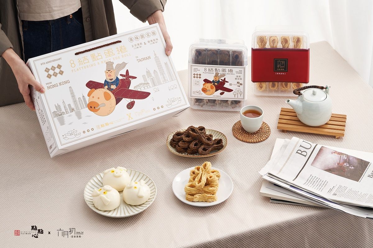 2023年點點心首度與伴手禮界的人氣品牌「六月初一」合作,推出『8結點蛋捲』港味限定版禮盒,首次推出港式口味『正宗港奶』,將港式文化中的代表飲品化作涮嘴茶點,選用茶香味濃厚的錫蘭茶葉與恰好比例的黑白淡奶相互碰撞。除了推出全新口味,禮盒設計由品牌吉祥物「豬大師」開著豬仔專機,兩側還有維多利亞港與台北信義區的代表建築。
