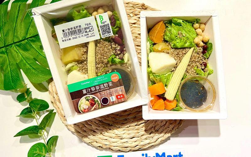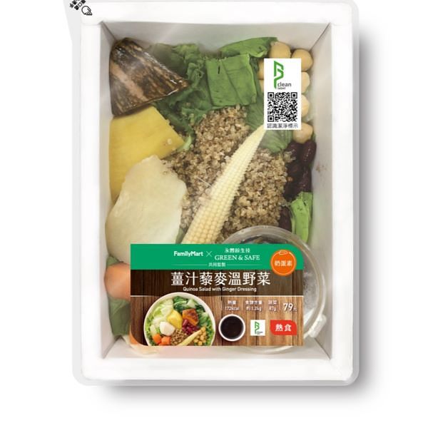 因應全球綠色飲食風潮興起,「全家」與GREEN&SAFE永豐餘生技推出「薑汁藜麥溫野菜」,以市面少見加熱型溫沙拉形式,搭配紅藜、紅腰豆與鷹嘴豆等超級食物及當季生鮮食材,強調以原型食物取代精緻澱粉,讓每一口都吃得到真食物,售價79元,12/27前以全盈+PAY支付即享10元折價。