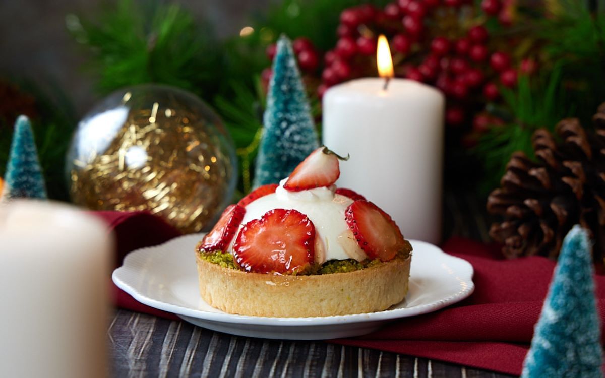 以聖誕節元素的綠、白、紅打造出「綠野仙蹤」,由主廚研發特製的抹茶起司慕斯蛋糕為基底,並以漸層方式由淺至深,最後擺上繽紛的莓果與抹茶蛋白糖點綴,入口抹茶香氣撲鼻,溫柔綿密口感在口腔中化開,令人食指大動!。