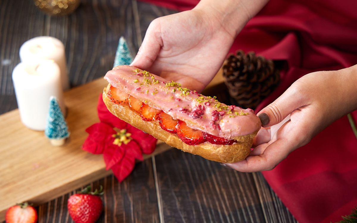為迎接聖誕,創意甜點法國,經典甜點代表-閃電泡芙,主廚這回將法國質送的泡芙殼改變形狀,圍成一圈,並擠入特製的草莓優格醬,放入大顆鮮紅可口的新鮮草莓,並蓋上泡芙殼,撒上珍珠糖與杏仁粒點綴,入口層次分明,酸甜口感,完美呈現,在櫥窗裡,必須站在C位,手機已迫不急待想先吃啦。