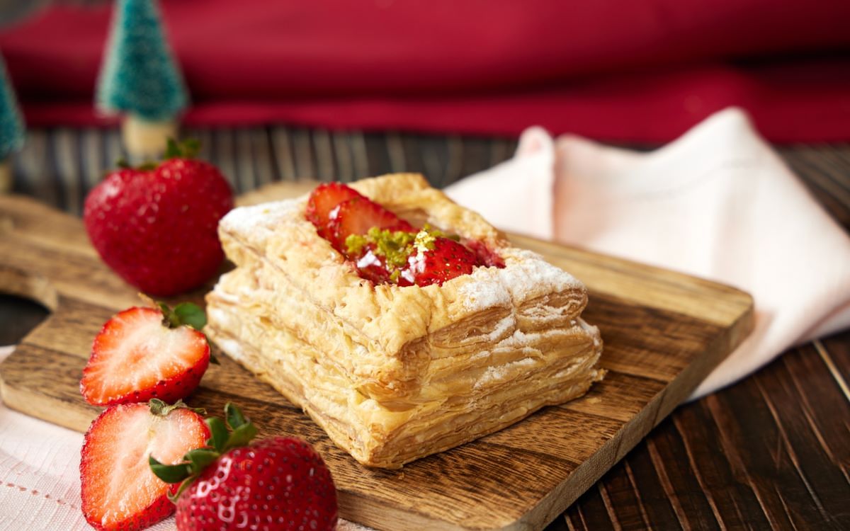 提到PAUL,自然聯想到明星商品-草莓千層派,2022年的聖誕季,主廚靈光乍現,運用法國直送的千層派皮與草莓為元素,創作出「紅鑽莓好派司」,千層派皮烘烤到蓬鬆,於派皮中央劃出凹洞,倒入特製的起司莓果醬,再鋪上新鮮草莓,並撒上開心果仁點綴,酸與甜包覆著味蕾,舌尖上濃郁的幸福滋味。