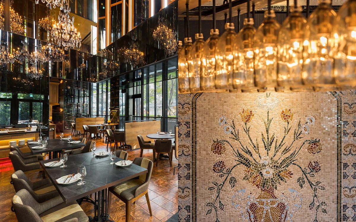 「春大直店」空間設計延續林森北路時期的裝潢風格,將原餐廳的水晶燈、鎢絲燈、以及具50年歷史風華的義大利馬賽克拼貼原汁原味移植到新店址,賦予空間濃厚的故事性。入口處添加了以甜點擠花袋概念設計的大型裝置藝術,增添空間的戲劇性及用餐的幸福感!