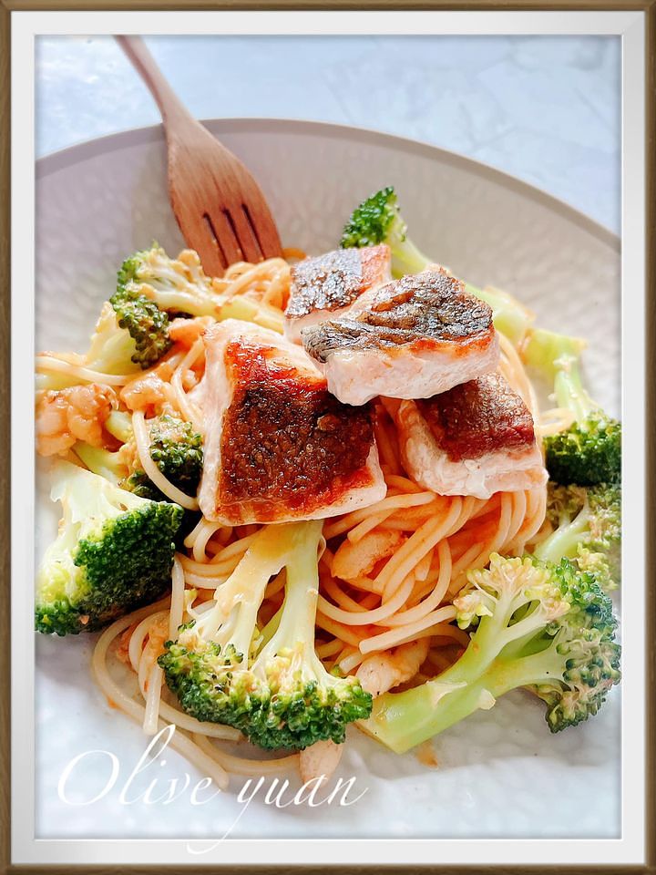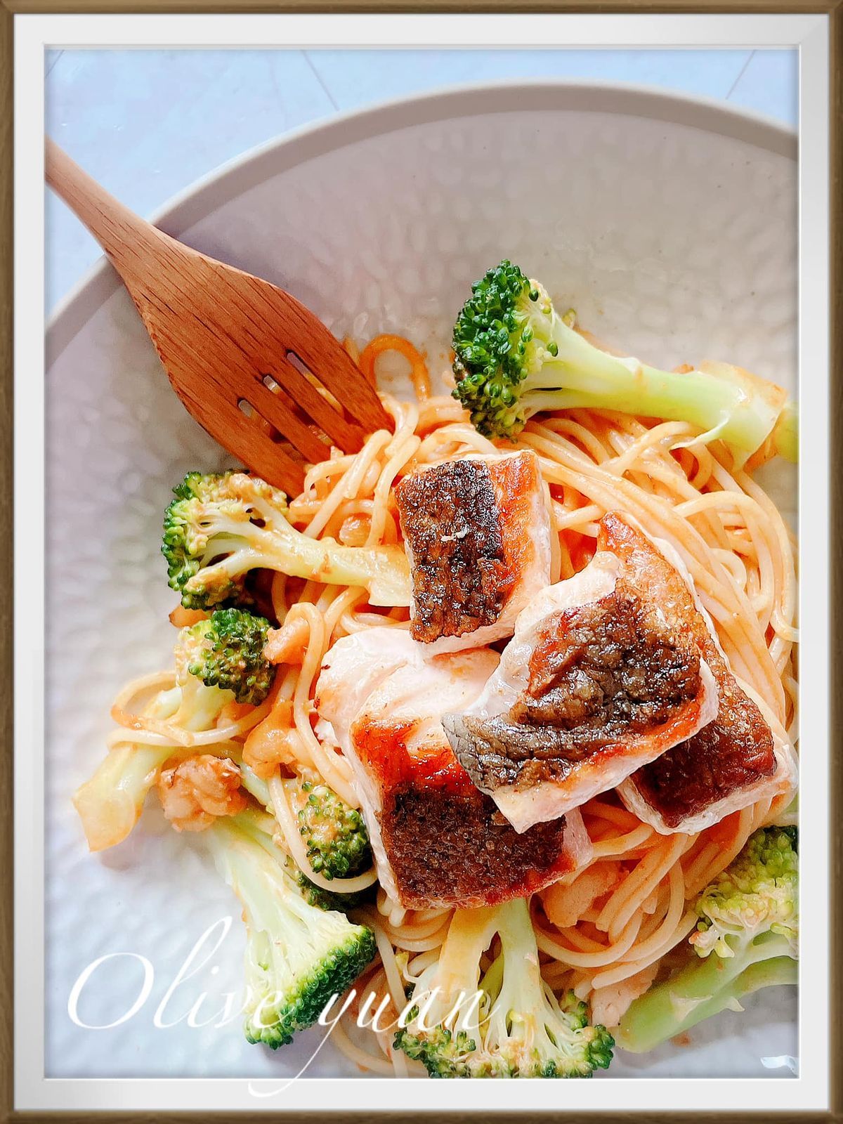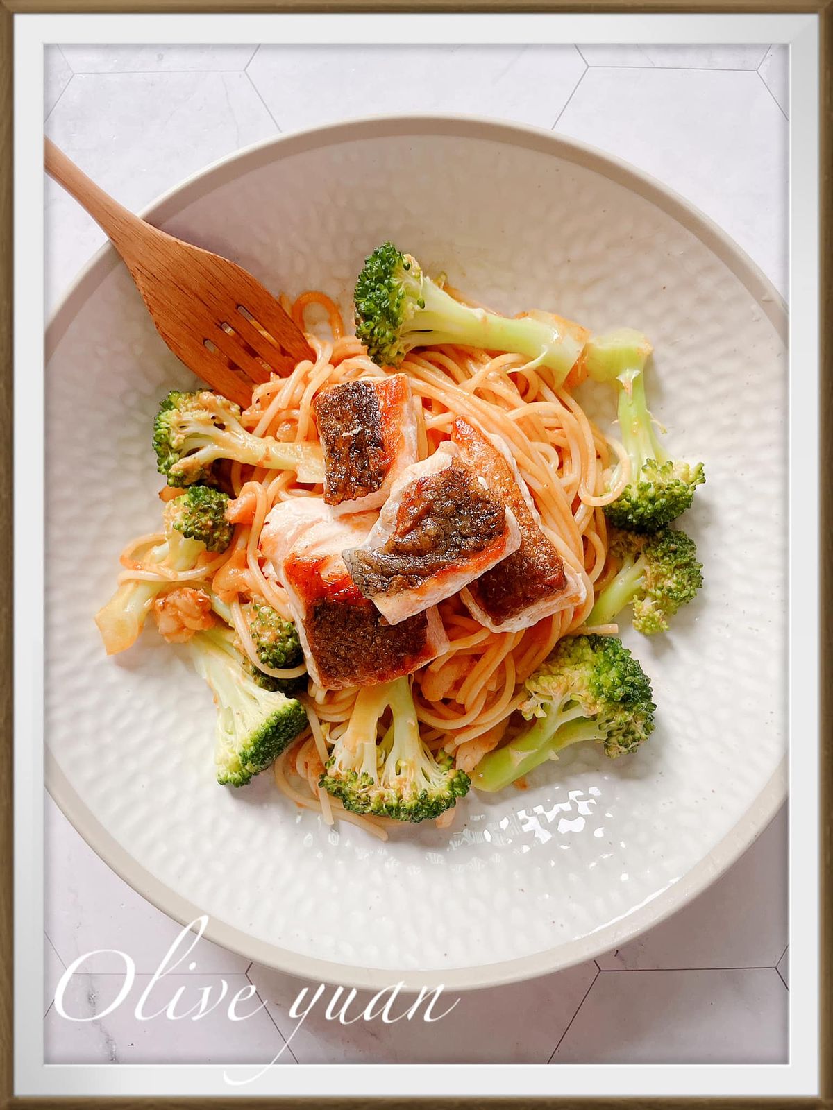 還有半份「72有鮭魚 挪威頂級鮭魚塊」,那就來做義大利麵吧!義大利麵調理包就選「Kewpie蕃茄奶油蟹醬」,感覺跟鮭魚的味道很搭。冰箱還有一盒冷凍蟹肉,再加點花椰菜營養均衡。