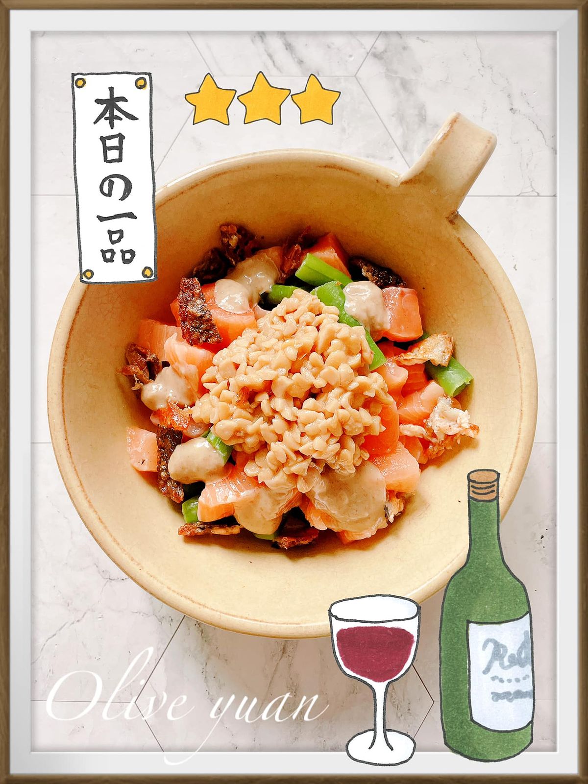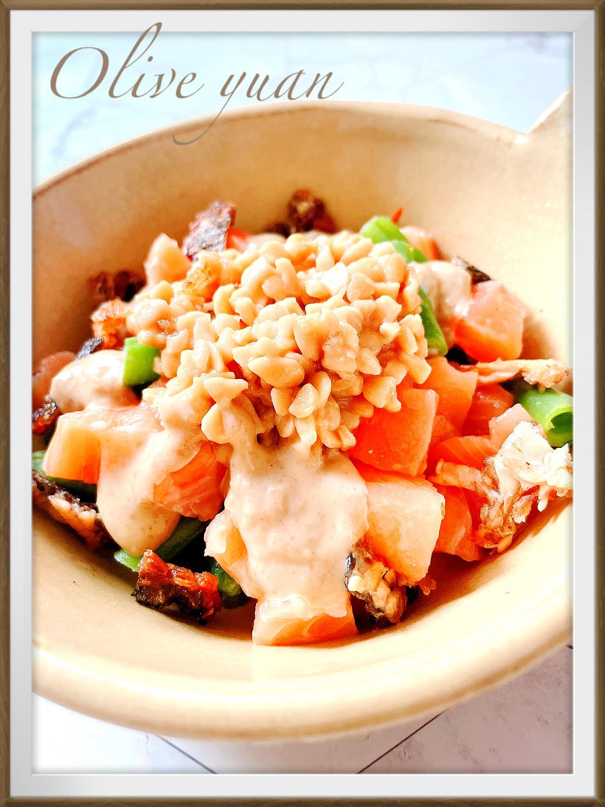 我今天用的是「挪威頂級鮭魚塊」,先把魚皮剃除,鮭魚肉切成小丁,然後拌入四季豆、納豆、芝麻醬,魚皮不能丟掉,直接把它煎得酥酥脆脆,再拌入鮭魚肉,所以偶爾會吃到酥脆魚皮的口感。