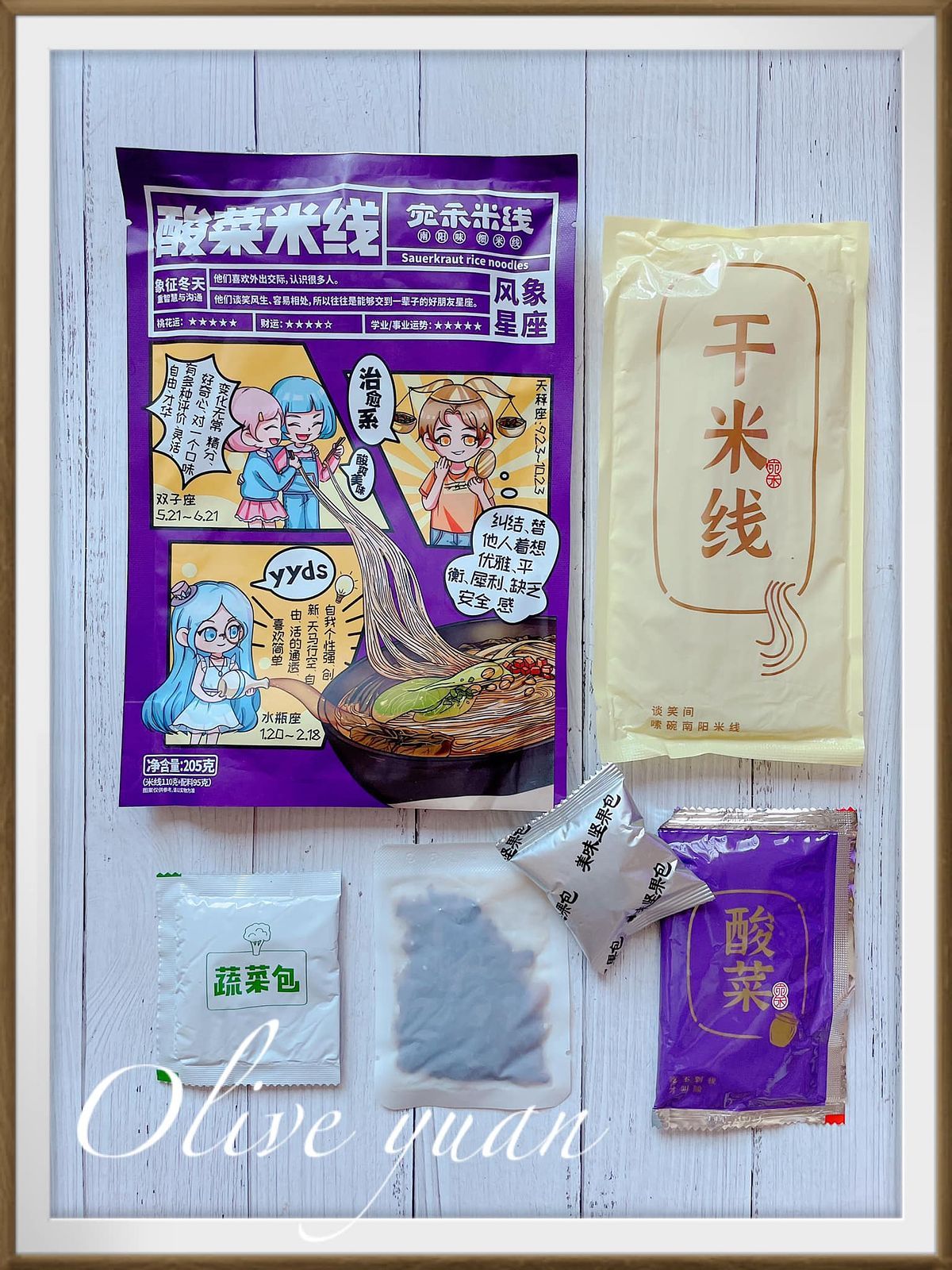米線的配料也很特別,除了主要的酸菜或藤椒,都會有乾燥木耳絲、炸碗豆、切碎的豆皮,跟台灣或日本泡麵的配料完全不同。對了,這個要用煮的喔!而且說明書都會建議你加450ml水但會鹹死,600ml剛剛好。