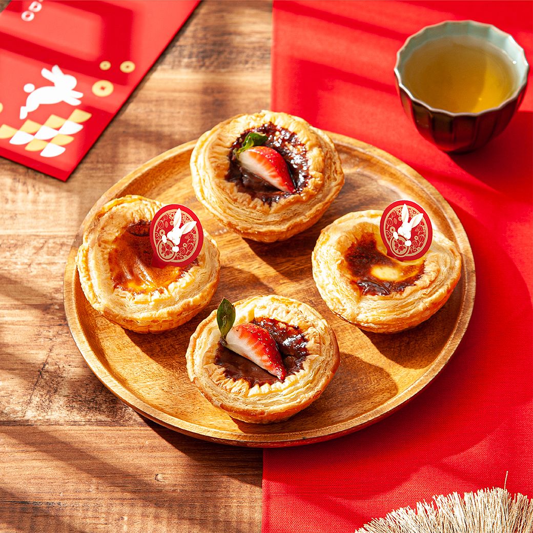 圖片來源:八月堂 八月堂於 1/6(五) 全台門市推出的新品,結合此次新年主題「Nice 兔 me chill」,透過送禮來傳達新的一年對親友以及許多新朋友最真摯的祝福,其中「錢兔雙喜蛋塔禮盒」一盒包含兩款口味-必吃的經典奶香口味以及人氣朱古力,以千層香酥的塔皮搭配迷人蛋奶香內餡,滑嫩布丁口感搭配多層次金黃酥皮,交織成舌尖的極致饗宴,一盒共六入必吃經典奶香原味與人氣朱古力搭上當季新鮮草莓,雙重享受,一次滿足,絕對會是今年走春拜年的最佳伴手禮。此外,春節拜訪親友時,當然也少不了送上好酒的選項,因此八月堂今年特別將可頌與經典奶酒結合推出「微醺奶酒可頌」,以經典卡士達醬加入世界級知名咖啡利口酒,特製成香甜帶有咖啡酒香的滑順卡士達,搭配酥鬆脆口的可頌,一口咬下咖啡奶香味與卡士達與酥鬆可頌完全融合,是新年最 Chill 的選擇!最具年節氣氛的新商品讓你在年節送禮時能送上滿滿的心意。來吧!新的一年與親朋好友,享受最 chill 的微醺時刻。