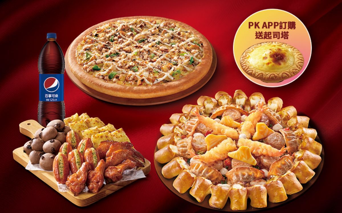 必勝客「財圓滾滾金干蝦比薩」大比薩899元(可搭配外帶買大送大、外送買大送小優惠),小比薩629元!因應年終、尾牙聚餐需求,必勝客也推出「一訂開運團圓餐」,包含「財圓滾滾金干蝦比薩」在內的兩個比薩、Hot燒大拼盤與1.25L可樂,限時優惠只要1,459元,外帶外送都適用!為回饋忠誠會員,透過PK 雙饗卡APP訂購,再加贈冰藏起司塔1個!今年開工聚會、新年團聚就用「財圓滾滾金干蝦比薩」,為新的一年帶來好財運,向親戚朋友、同事長官表示感謝,說聲「金干蝦」!
