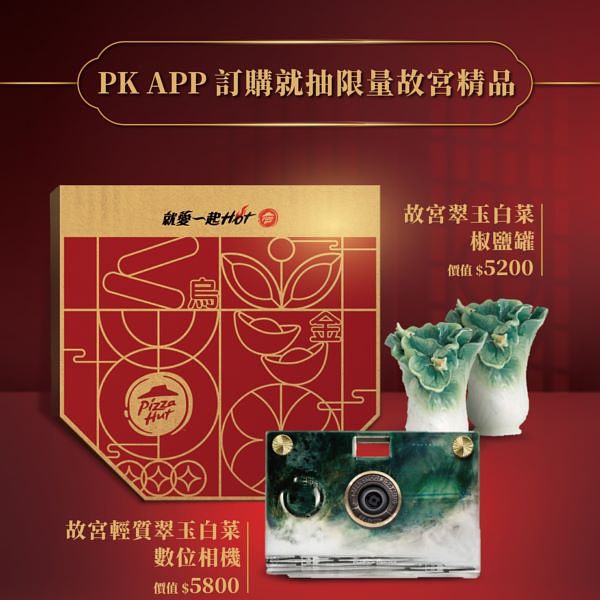享受史上最豪華年菜比薩不必等過年!必勝客「奢華加貝烏金鮑魚比薩」即日起限時限量開賣,優惠價只要1,099元,會員透過PK雙饗卡APP訂購還能再抽創意與質感兼具的獨家好禮-價值超過5,000元的故宮精品「翠玉白菜法藍瓷椒鹽罐」、「輕質翠玉白菜數位相機」,現在就上必勝客PK 雙饗卡APP搶訂,手速慢可就吃不到了!