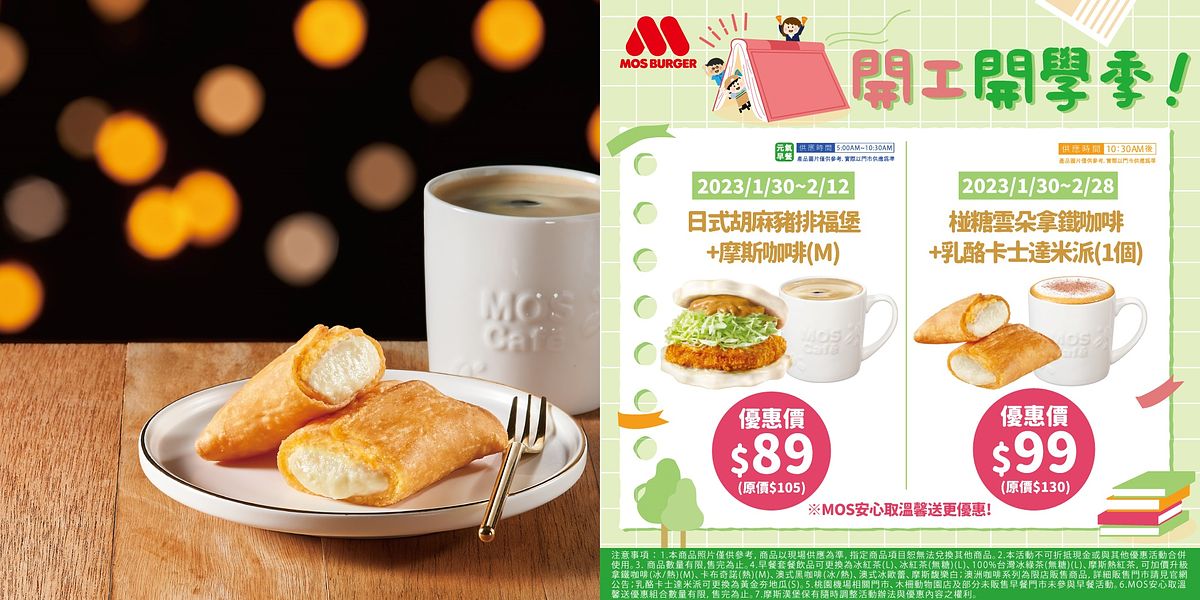 摩斯於1月30日至2月12日止,推出日式胡麻豬排福堡及中杯摩斯咖啡,優惠價89元,2月13日至2月28日止,元氣牛肉蛋堡及中杯摩斯咖啡,優惠價89元。