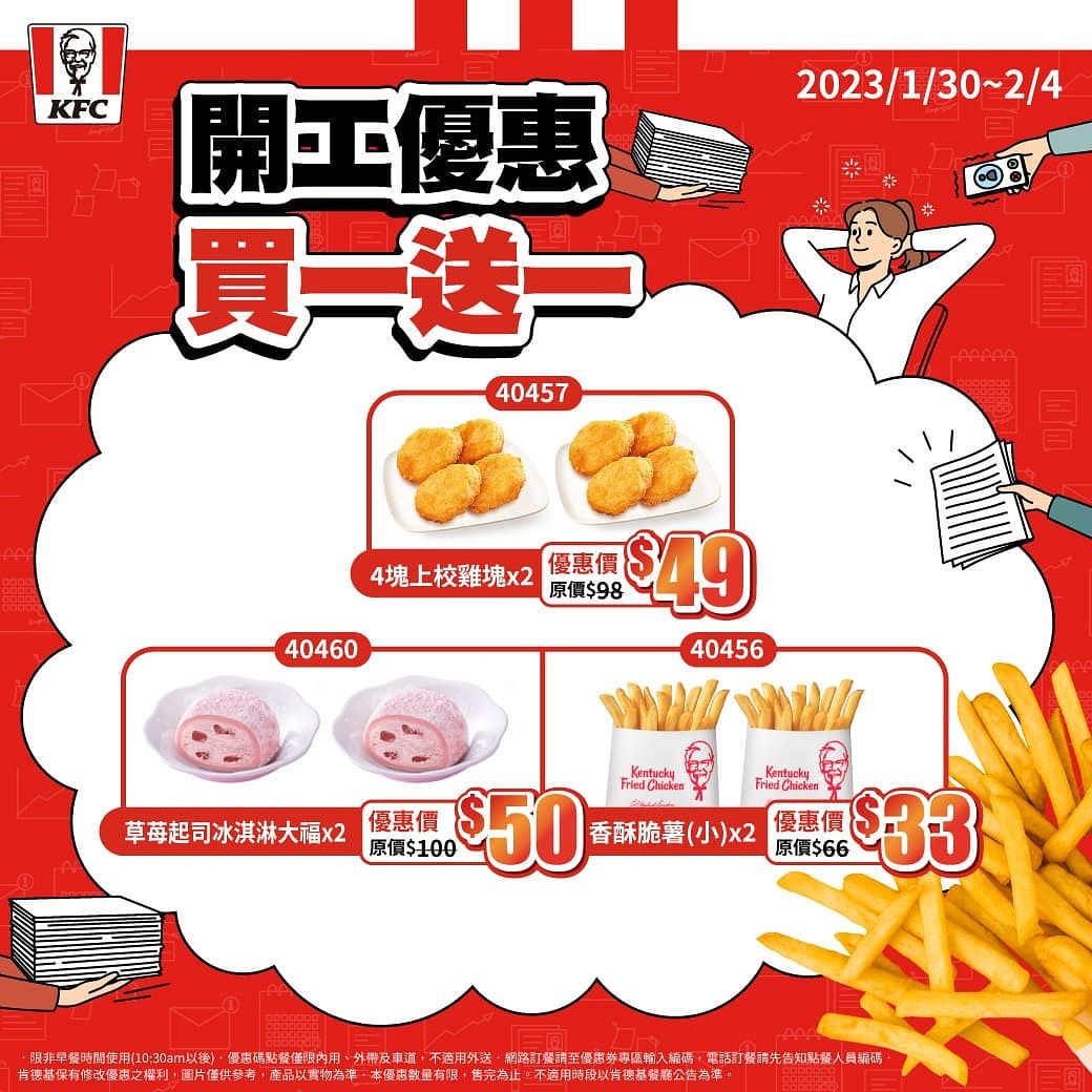 1月30日起至2月4日,肯德基推出「開工優惠買一送一」,包含五大人氣商品:4塊上校雞塊、香酥脆薯、玉米濃湯、草苺起司冰淇淋大福、可樂,只要於優惠期間內至全台肯德基門市出示優惠代碼,全部買一送一。