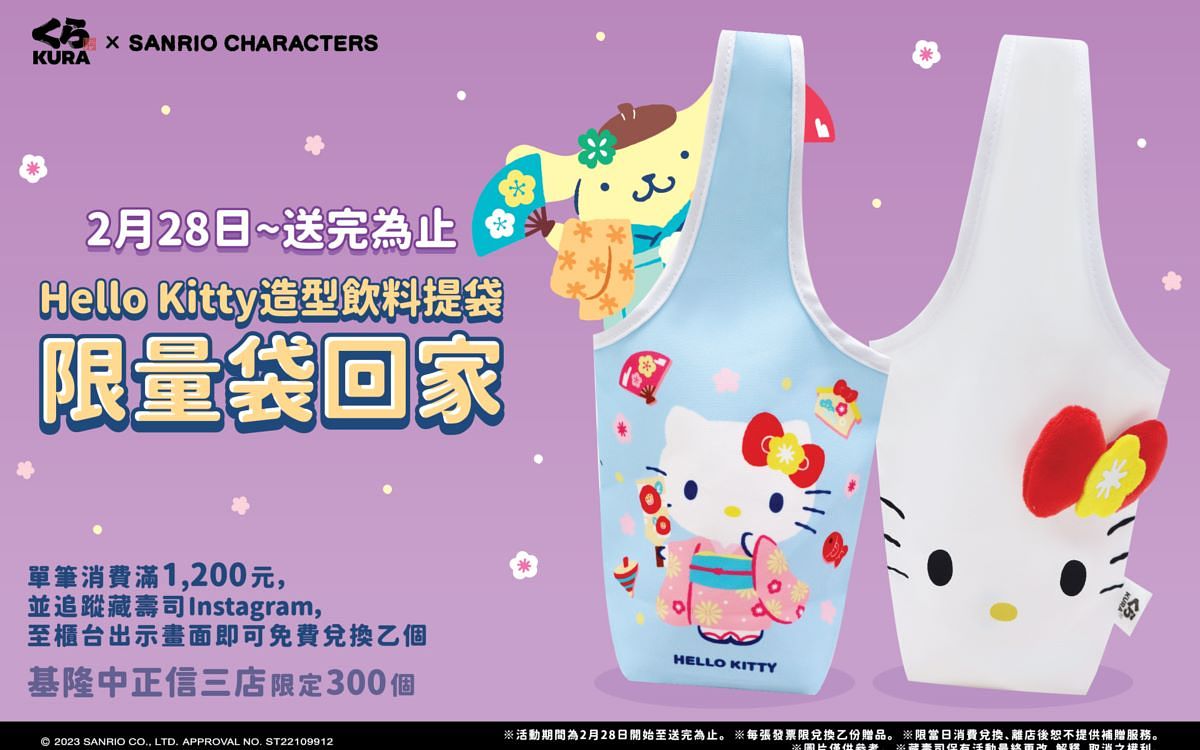 除了祭出優惠活動之外,藏壽司還特別為基隆的藏友們準備全台只有基隆中正信三店才換得到,換上日式傳統的和服的「Hello Kitty 造型飲料提袋」來溫暖大家的心!雙面都有不同的設計,不論是大頭造型的Hello Kitty,還是身穿日式傳統和服的設計,都一樣可愛!從2/28起,只要當日單筆消費滿1,200元並追蹤藏壽司官方Instagram,至櫃台出示畫面即可兌換「Hello Kitty造型飲料提袋」,好禮數量有限,換完為止,想兌換的藏友們還不快前往基隆中正信三店用餐!