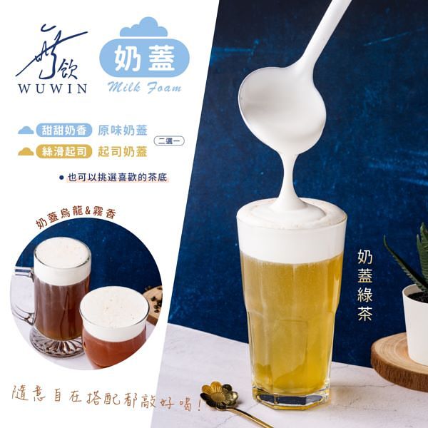結合三款超人氣無飲單茶「茉香綠茶」、「霧香紅茶」、「炭燒鐵觀音」,也可以挑選喜歡的單茶加上奶蓋,隨意自由搭配都超好喝!