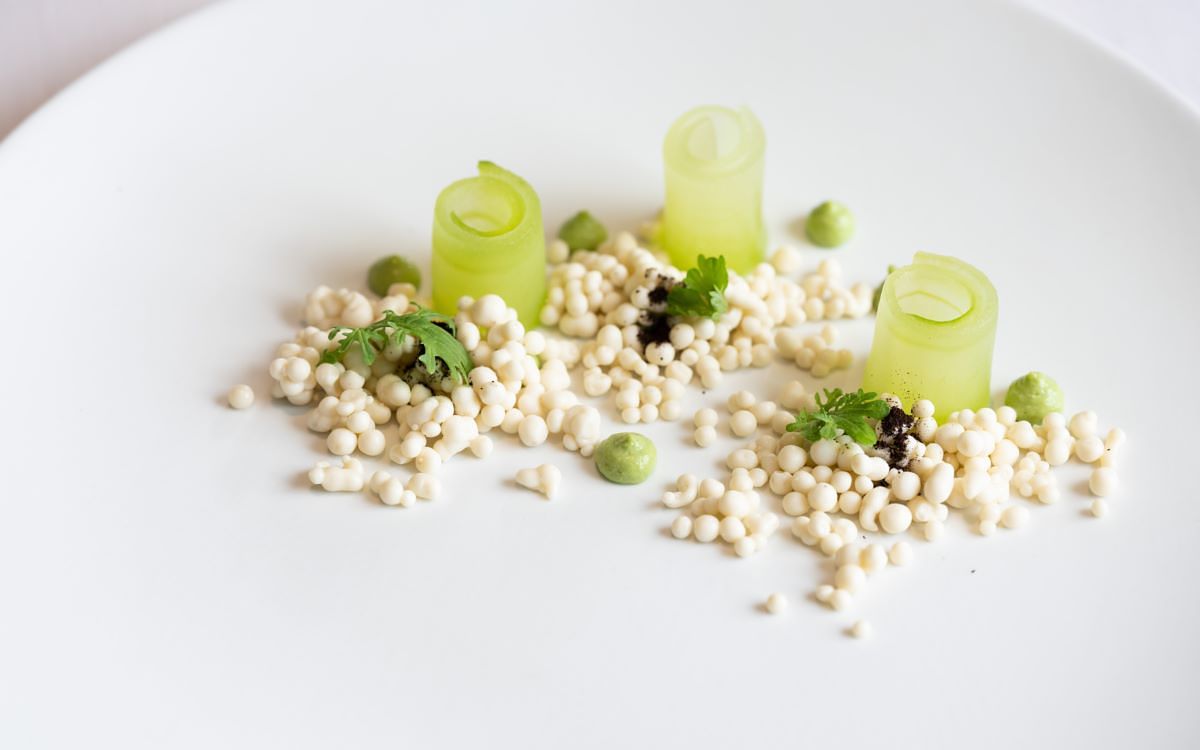 圖片來源:慕舍酒店新春季套餐中亦搭配有經典菜色,「Molino 後院」為渥達尼斯磨坊的招牌料理,主廚David 在西班牙本店的餐廳有座後花園,推開後門走進院中,呈現著青草綠地欣欣向榮的意象,菜品以生蠔融入帕馬森起司與牛奶,綴以綠意盎然的生蠔香草醬,卷起的黃瓜由米醋跟香料醃製,一同品味入口感受多重層次的酸脆清爽口感。