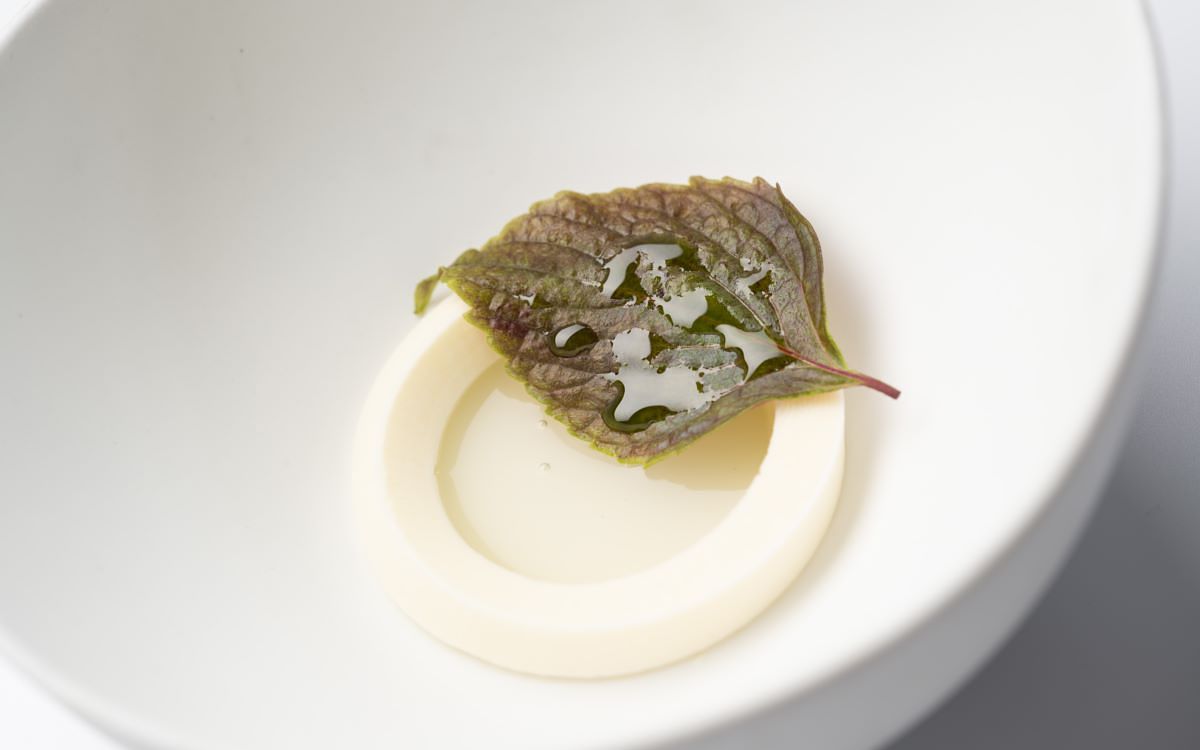甜品「青塘」選用台灣具代表性的水果-芭樂入菜,主廚重視著運用在地食材的永續理念與特色,萃取而出的芭樂香甜果液與紅紫蘇葉的清雅微甜交相呼應,注入於雪莉酒冰淇淋塑型的巧緻塘泊中,水色照映光影曳曳,沁涼香氣如湖水潺潺化入心田。