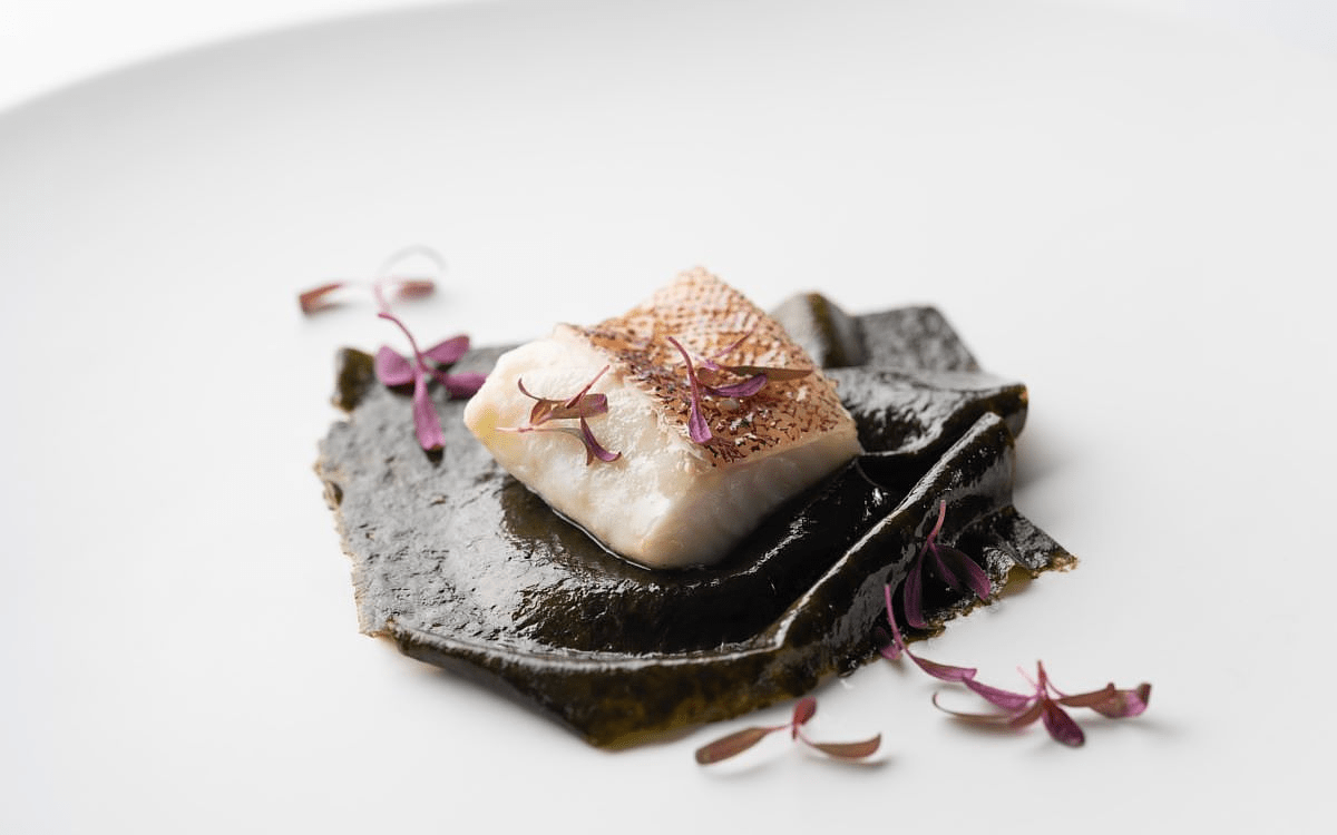 「海韻」結合台灣在地魚鮮、揉合馥郁海洋氣息的日式海帶,搭配著迷人甘醇的法式醬汁,將來自世界各地的風情完美交融,為初春綴以浪漫旖旎的海中香韻。主廚將魚肉的飽滿多汁以真空低溫烹調手法封存,海帶融入了酸豆水的清新與煙燻奶油的醇厚韻味,恰到好處的襯托出海帶的甘鹹滋味,口感彈潤佐以輕酸爽口的法式魚湯醬汁,感受來自大海的原萃鮮蘊。