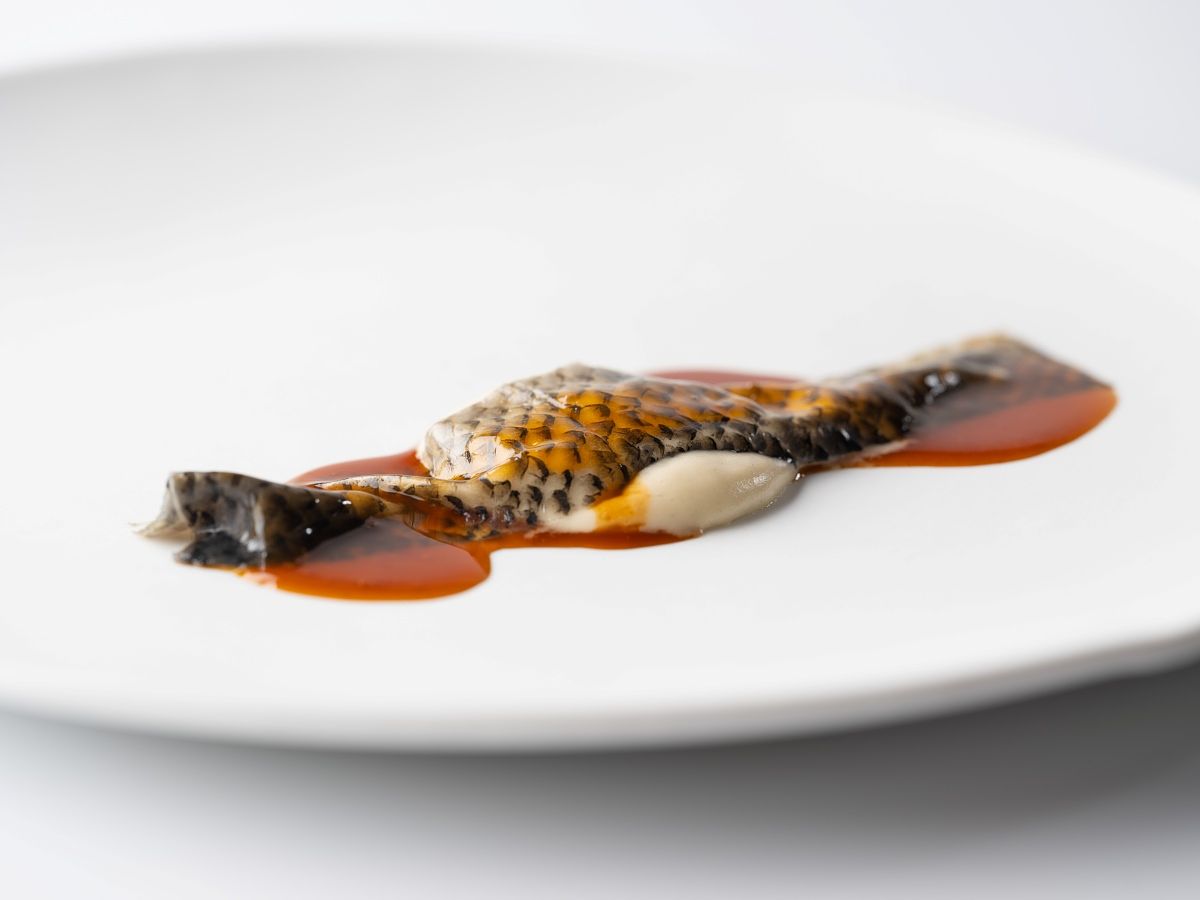 「岩浪」的主角魚皮為料理中較常被捨棄的部分,主廚以環境永續的思維理念,將之保留並發揮巧思激盪出食材的絕佳風采。自取下魚皮及其幼滑部分,經舒肥烹調後維持柔嫩質地與別緻的鮮甜味,輕柔覆以魚肉與奶油製成的雪白泡沫之上,佐以紅甜椒與高湯融萃而成的琥珀色醬汁,蓬鬆輕盈化於舌尖,宛如海邊擊打岩石後所迸發的晶瑩浪花,恣享徜徉於暖日微風中的悠然愜意。