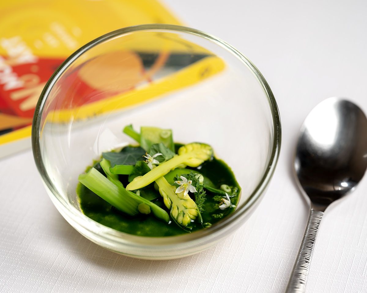 「綠野」將視線拉回到庇里牛斯山谷中令人心曠神怡的綠地。將海鮮香氣不斷堆疊,感受蛋奶醬綿滑的口感,緊接著舌尖將會品嘗到一股鹹香煙燻的鯷魚及沙丁魚香氣,翠綠的黃瓜醬汁清爽調和奶醬的濃郁,延續呈現