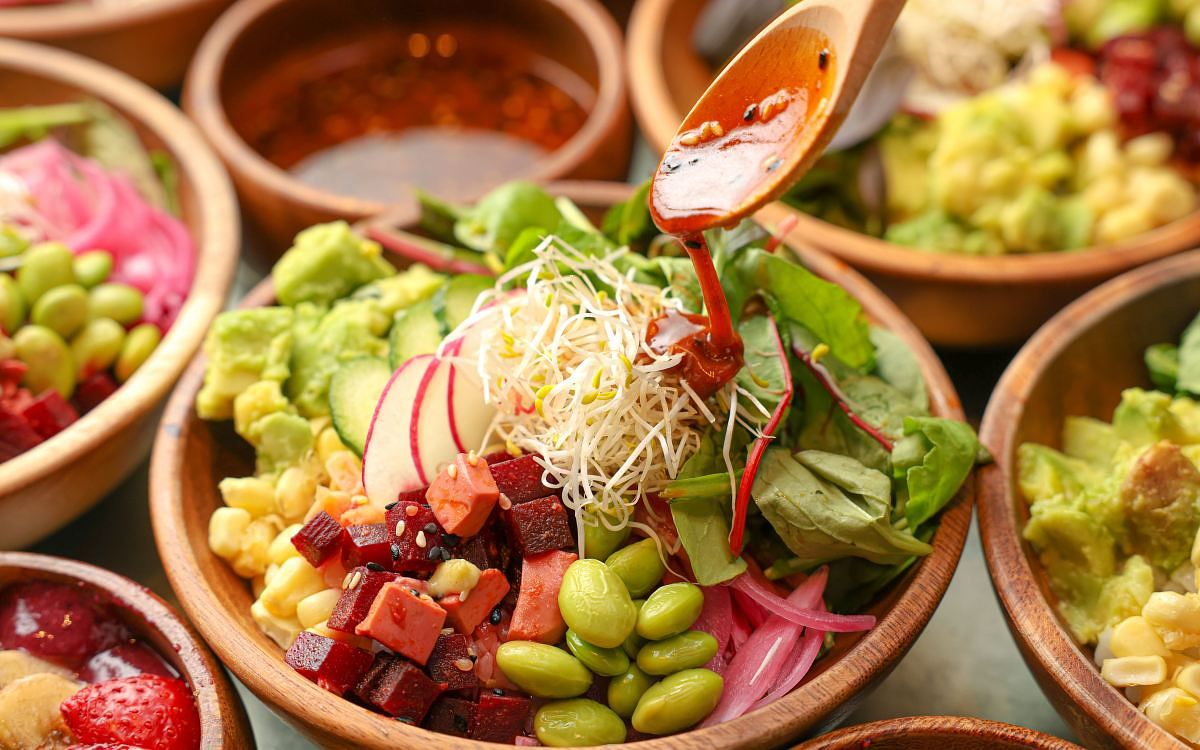 圖片來源:台北晶華酒店 靈感來自於夏威夷波奇碗 (Poké Bowl)的美顏佛陀碗 (Glow Bowl)是將切成塊狀的蒟蒻與豆腐,以甜菜根汁熬煮上色入味,做出如同生食鮪魚的紅寶石光澤,搭配以薄鹽醬油、綠芥末和是拉差醬調和成的日式口味醬汁,比真正的鮪魚 Poké Bowl 還要健康美味。