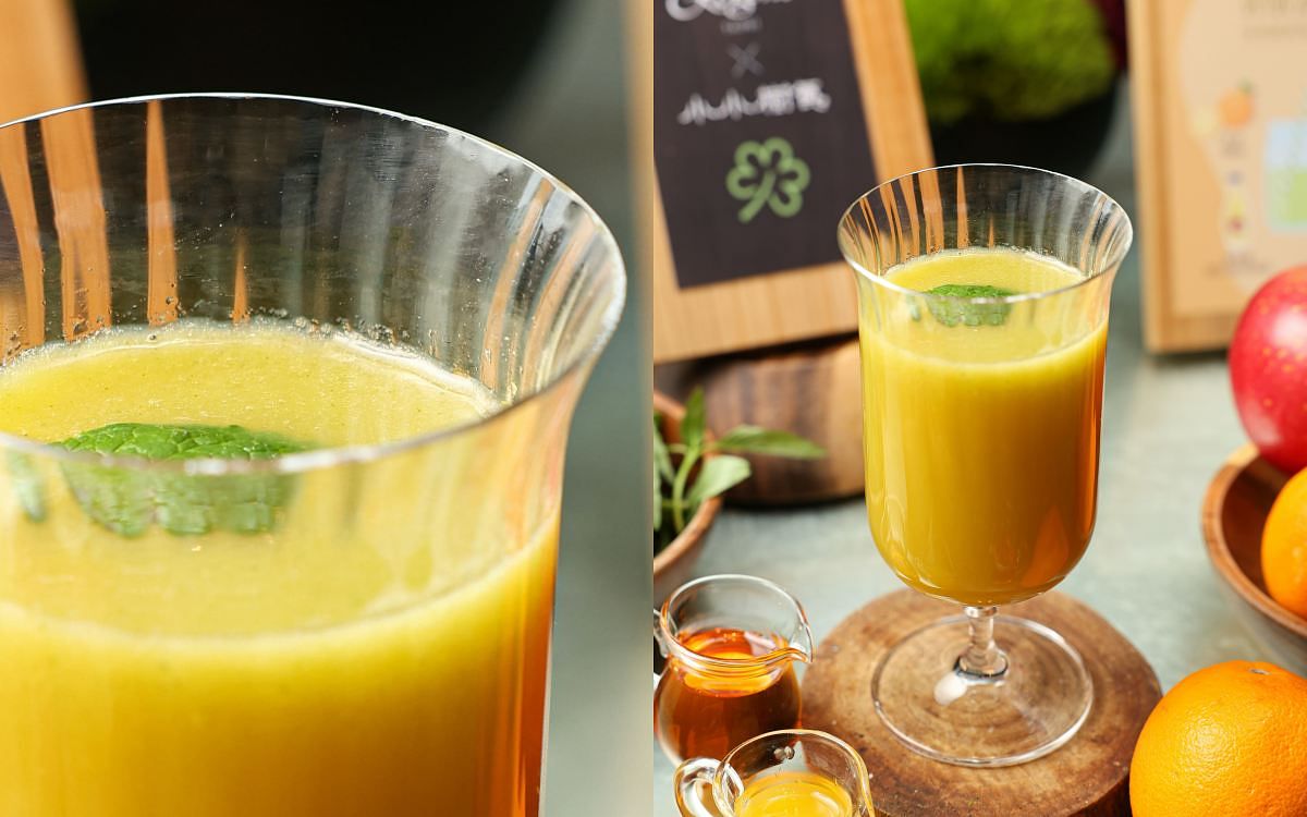 餐檯上最為吸睛的飲品--「香橙羅勒蔬果飲(The Great Detox Juice)」是以富含抗氧化物--維生素E、被譽為防癌聖品的新鮮羅勒,搭配可以幫助酸鹼中和的蘋果醋及柳橙汁,最後加入蜂蜜綜合甜味而成,酸甜中帶有馥郁的果香氣息。