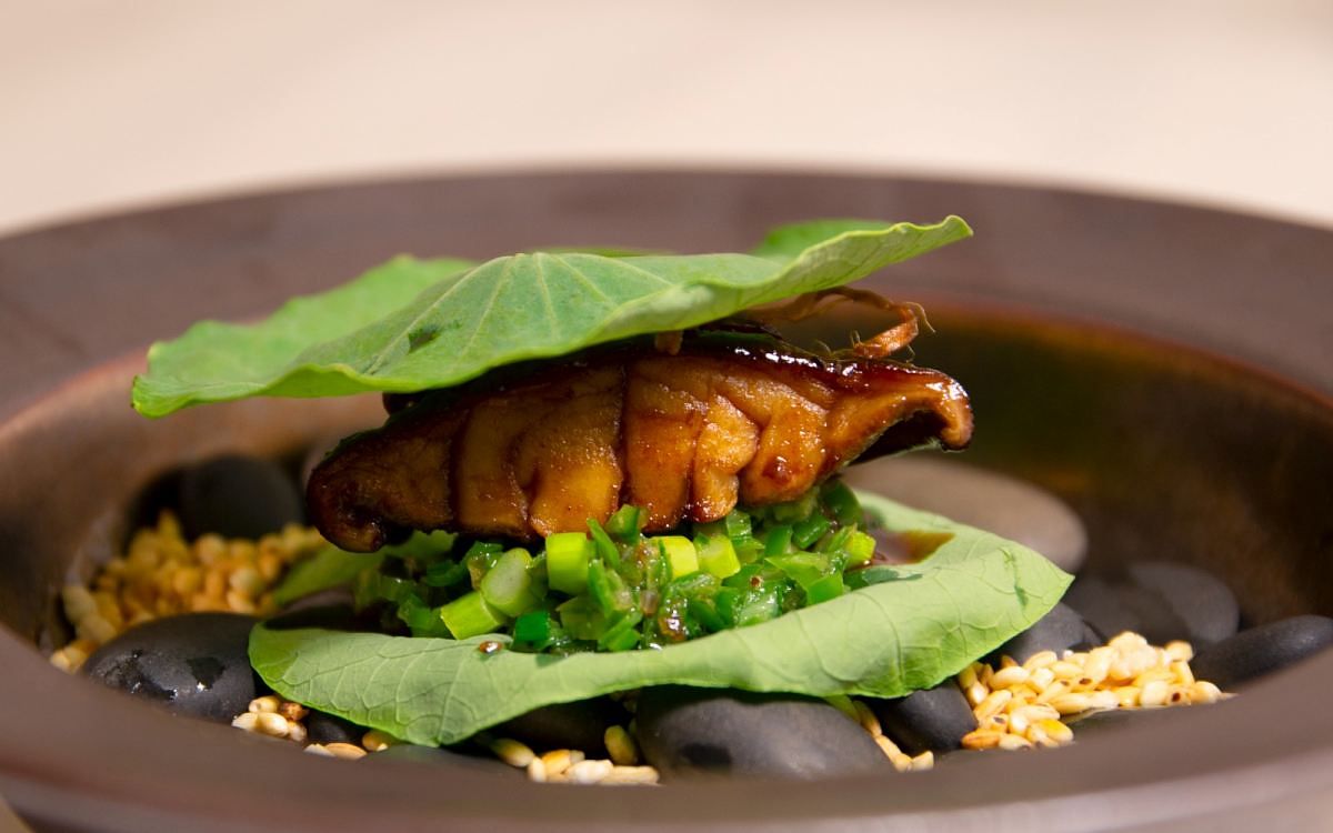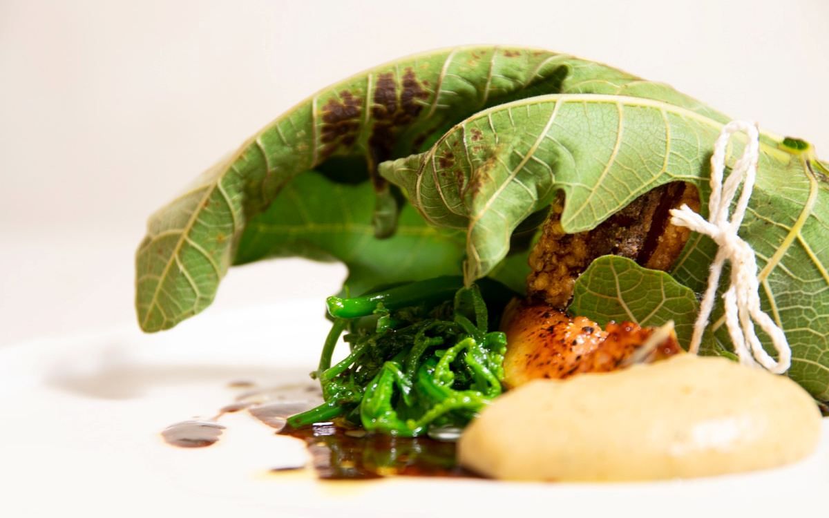 圖片來源:curious 本季主餐「獵人」,靈感源自 Tim 在花東旅遊偶然買到的獵人便當。獵人打獵出山時,往往會需要較長時間,因此家人們會為獵人準備鹹豬肉、鹹魚或菜脯等重鹹的食材,搭配糯米或小米包裹於假酸漿葉中,具有飽足感且方便保存、食用與攜帶。獵人便當飽含獵人對家中生技的期許,以及家人的關懷與愛。而 curious 在主餐中也選用來自矽谷新創品牌 Lypid 活優科技的純植物製油脂,透過微膠囊技術與配方研發出的 PhytoFat™,熔點高達 165°C,且 PhytoFat™ 油脂 97% 的主要成分為植物油和水,讓 Tim 特製的鹹豬肉能擁有豐富油脂口感而不膩口。