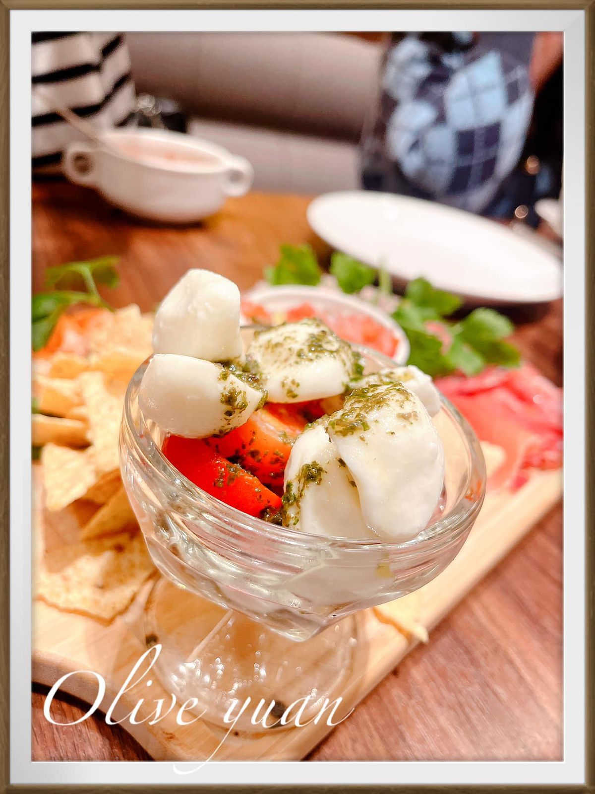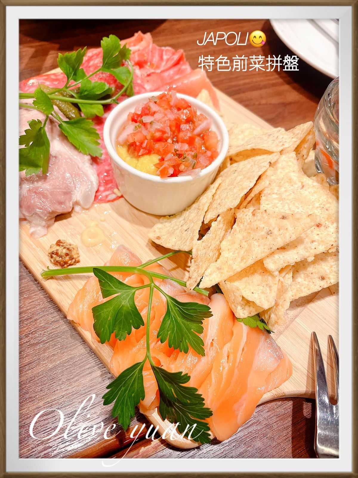 一開始大家分食的蕃茄湯跟凱薩沙拉,特色前菜拼盤的擺盤也好漂亮,就像是派對料理!
