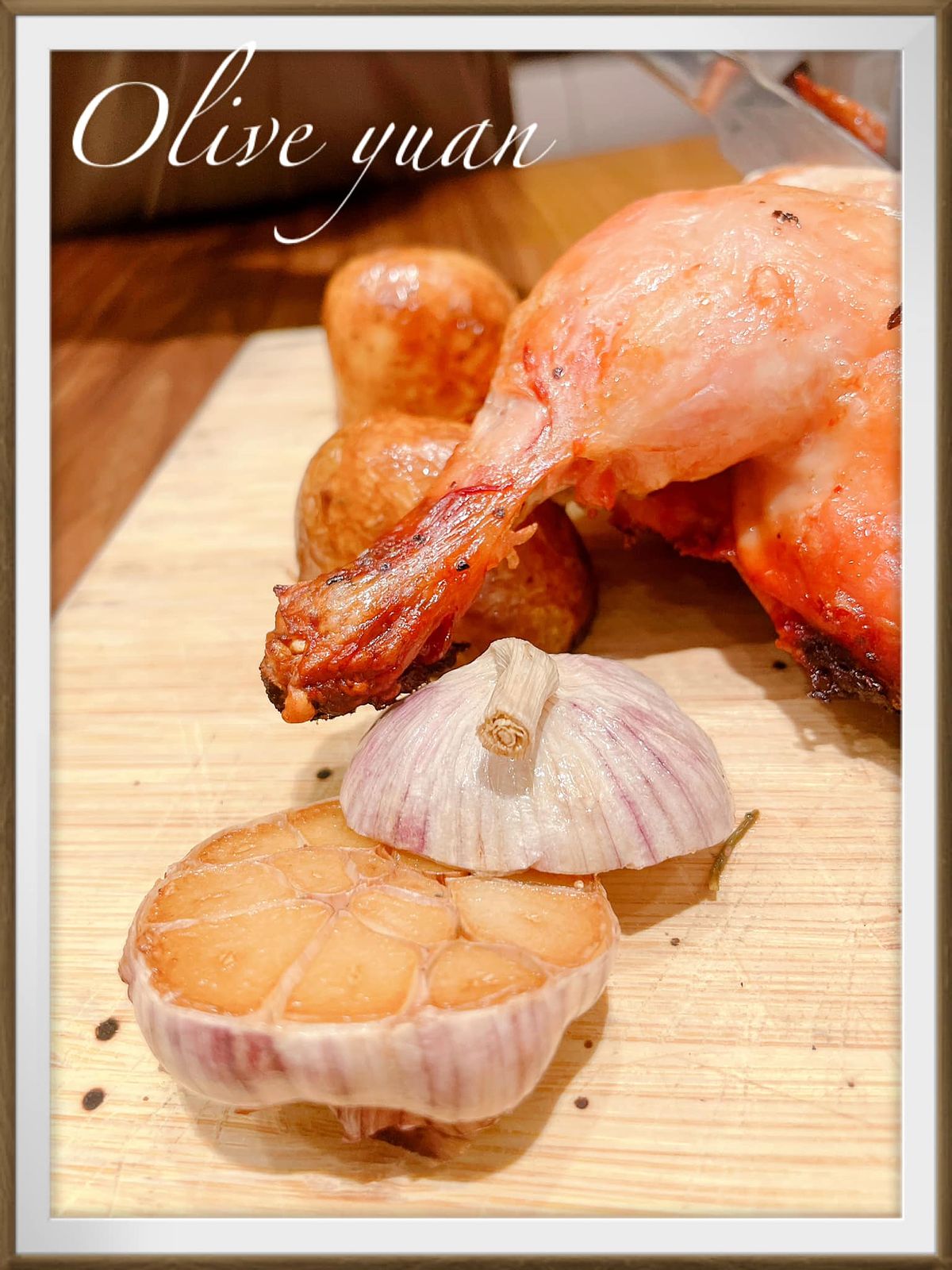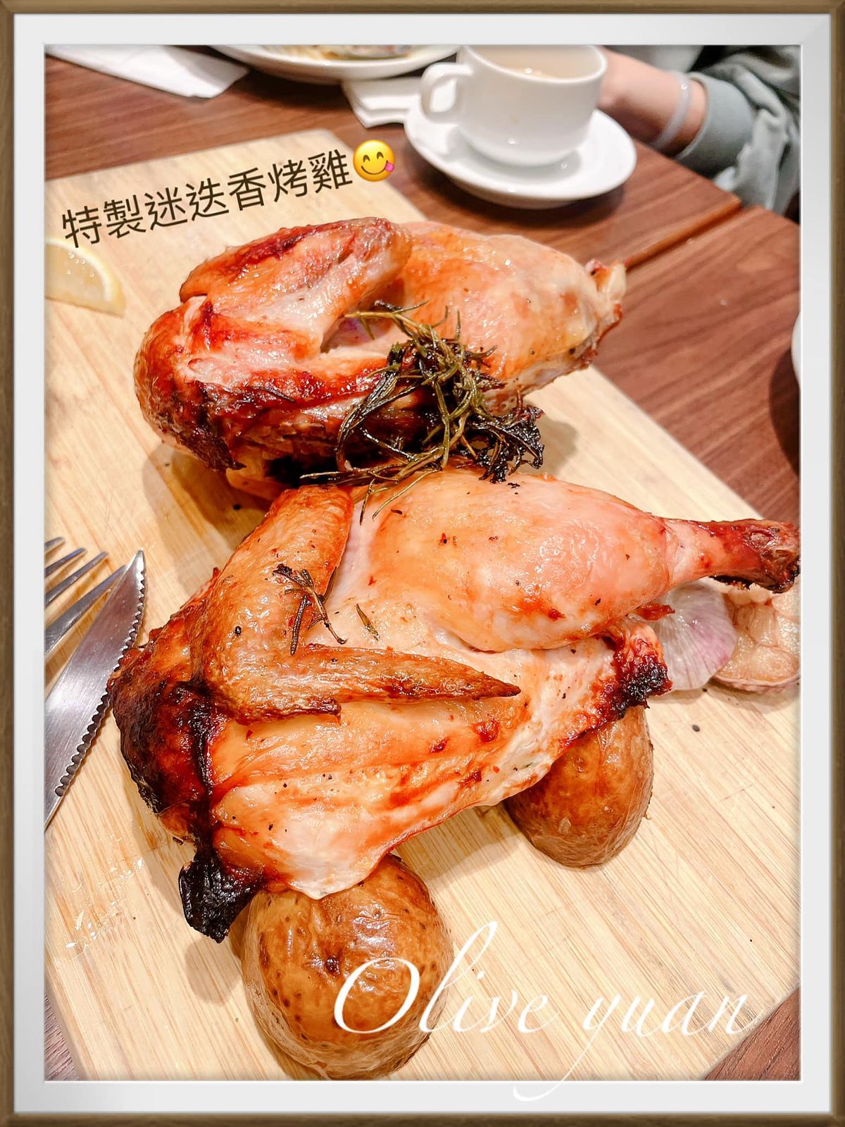 最後迷迭香烤雞上桌時,大家都傻眼,因爲這時應該已經10分飽,但看著雞皮散發的油光,還有旁邊很厲害的烤蒜頭,大家又繼續吃了起來!