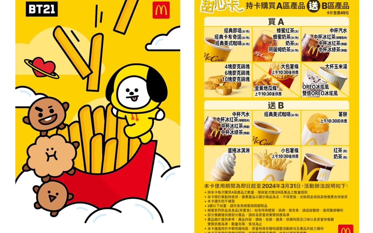 為持續提供消費者多元且划算的美味選擇,麥當勞3月15日開賣的「BT21甜心卡」,A區新增金黃地瓜條、雙倍OREO冰炫風及熱蜂蜜奶茶,B區的小杯熱紅茶與小杯熱奶茶則升級為中杯;「BT21甜心卡」共有4款卡片設計,包括KOYA與TATA降落麥克鷄塊的「迫不鷄待紅款」、CHIMMY與SHOOKY嗨開薯條趴的「心有所薯黃款」、MANG和COOKY在蛋捲冰淇淋上滑雪的「就愛冰紛綠款」,以及RJ與VAN享受McCafé咖啡的「想入啡啡藍款」;「BT21甜心卡」每一款合作設計都值得收藏,不只超萌、超療癒,更是超值享用麥當勞的必備省錢神器!