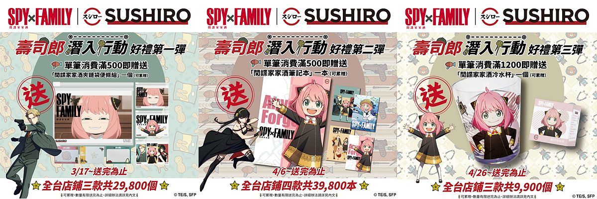 壽司郎獨家推出《SPY×FAMILY 間諜家家酒》滿額贈!夾鏈袋便條組、筆記本、可愛冷水杯!