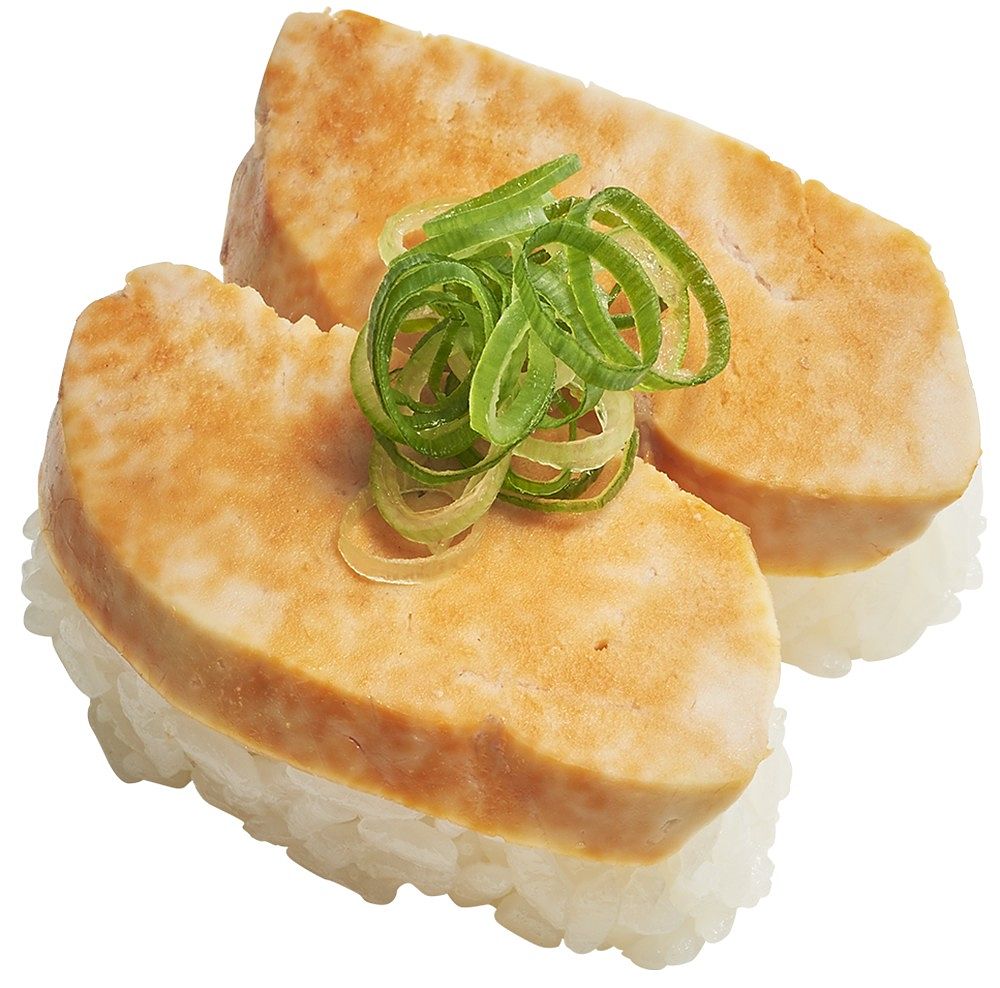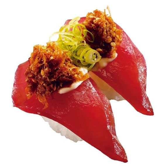 使用靜岡燒津市一本釣的高品質鰹魚,搭配壽司郎用鰹魚高湯底特製的鰹魚乾,再佐以少許美乃滋讓整體風味厚實豐富,是一道極具巧思的創作壽司。