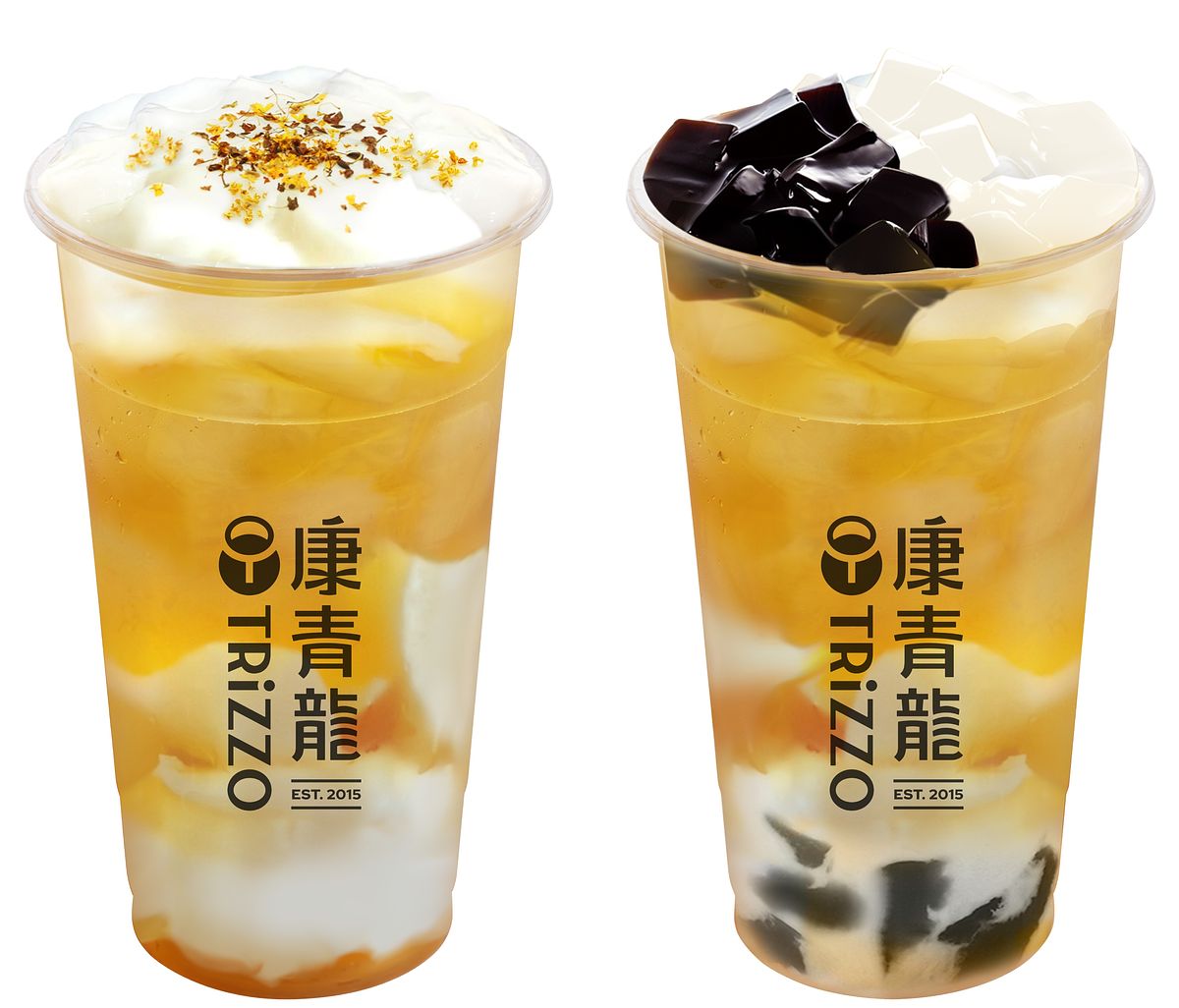 康青龍推出「杏凍時刻」新品,其中的「杏凍桂花金星」,嚴選台灣南投高山烏龍茶葉,精焙厚實茶味搭配高雅香氣的特製桂花釀,再疊加上一層層手作軟綿杏凍,輕飲一口即可感受桂花茶香,同時又能品嚐到香濃杏凍。