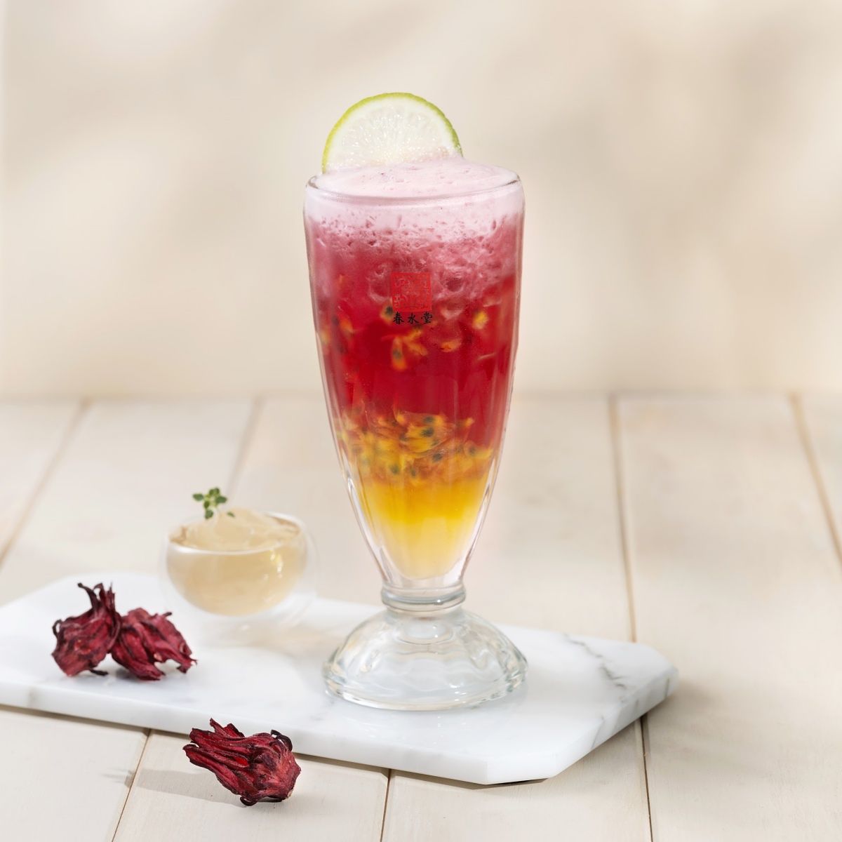 嚴選洛神花熬製的洛神汁為軸心,加入黃金蔗糖調泡,天然鮮紅透著光,如紅寶石一般清麗高雅;入口酸甜滑順,為盛夏消暑的養顏聖品。