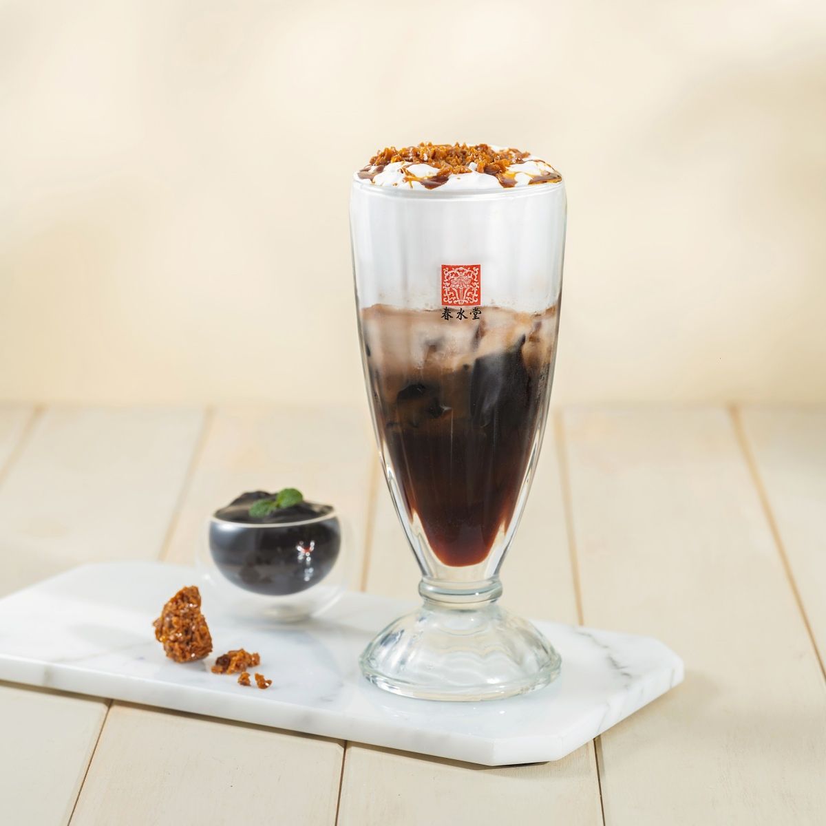 特選陳香普洱與滑嫩仙草的淡雅香氣為基底,濃郁黑糖襯托鮮奶甜香,口感圓潤、滑順迴盪唇齒,點綴上法國伊思尼海鹽焦糖脆丁,猶如法式甜點隨著每一口滋味層層疊進。