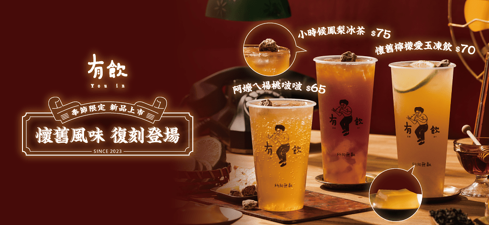 圖片來源:有飲 由Youtuber「欸你這週要幹嘛」的成員弟弟、Miffy在2021年創立了手搖飲品牌「有飲」,目前在台北已有四間分店,門店裝潢便以花磚、毛玻璃等復古風格。在韓國影集《魷魚遊戲》播出後便搶先推出「椪糖系列」飲品大受好評,從限時上架調整為常態販售。這次選在春夏之際推出古早味新品,把愛玉融入熱銷茶飲,楊桃結合有飲的熱銷氣泡飲,獨特風味、多重口感衝擊,打造出最好喝、最療癒的古早味手搖,帶你一秒進入時光機器。