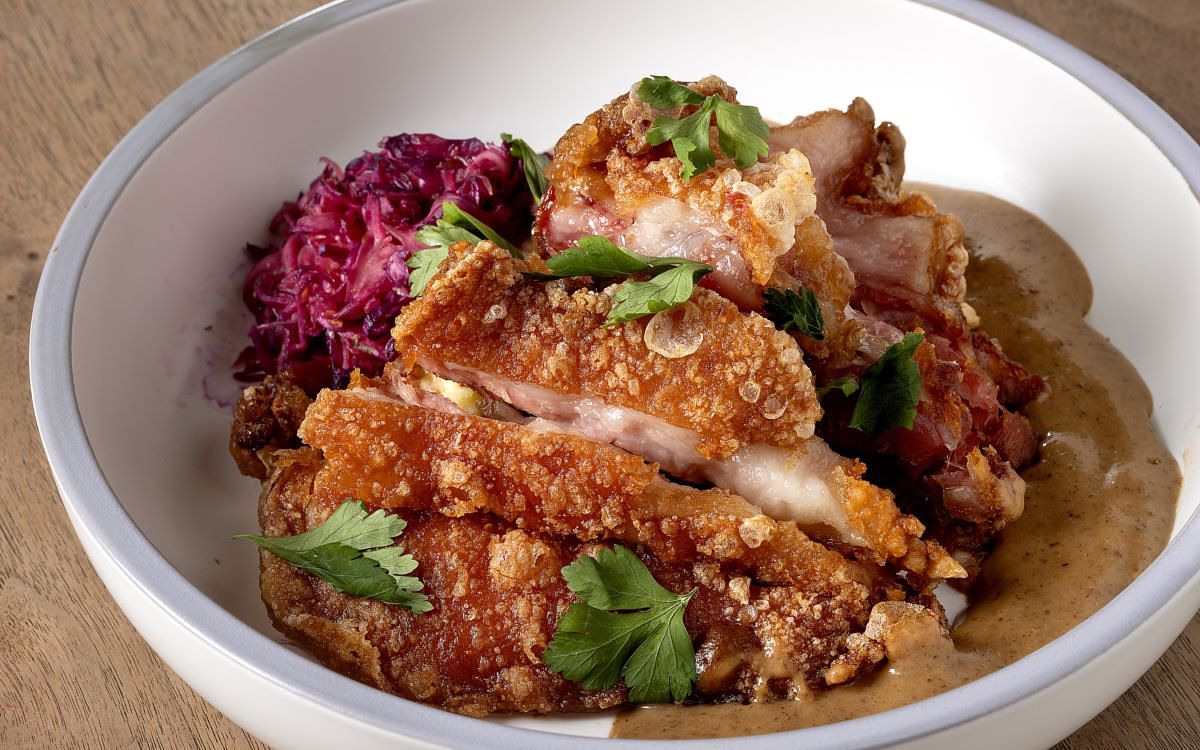 圖片來源:Smith & Wollensky 選用雲林究好豬腳去骨,先蒸後炸至表皮酥脆、膠質軟嫩、肉質Q彈,三種口感一次滿足,分量足足有10 oz.,搭配蘋果芥末醬,蘋果的甜香提升了法式芥末醬的風味,搭配肉類最為合適,最後搭配醃漬的涼拌紫高麗菜,以清爽的酸味做結尾。