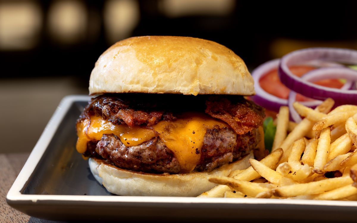 圖片來源:Smith & Wollensky 7oz.乾式熟成牛肉漢堡排足足厚達2公分,富含大量肉汁和乾式熟成獨特風味,搭配三種醬料:焦糖洋蔥、培根醬與S&W特製牛排美乃滋,再加入煎至焦香的培根與切達起司,搭配奶油生菜、蕃茄、紅洋蔥與酸黃瓜,另附上大份量的美式脆薯,餐廳自製的酸黃瓜辣椒配料是提升美味的小祕訣,香辣過癮,不容錯過!