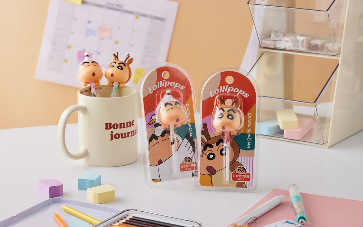 可愛到瘋掉的蠟筆小新公仔棒棒糖推出兩款造型,分別是鹿頭「鹿來鹿好運」與鶴頭「鶴家在有你」小新公仔,搭配可樂與草莓風味棒棒糖,以動物和台語吉祥話結合,不只造型逗趣可愛,更值得收藏。