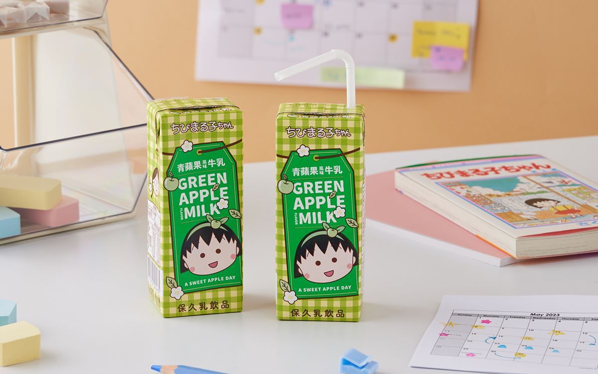 不管是卡通或漫畫都超受歡迎的櫻桃小丸子,新品「櫻桃小丸子青蘋果風味牛乳」有濃郁青蘋果香與優質乳香,每瓶同樣乳含量達50%以上,微酸微甜大小朋友都喜歡,側面更有小丸子最好的朋友小玉,陪伴大家一起享受美味的下午茶。