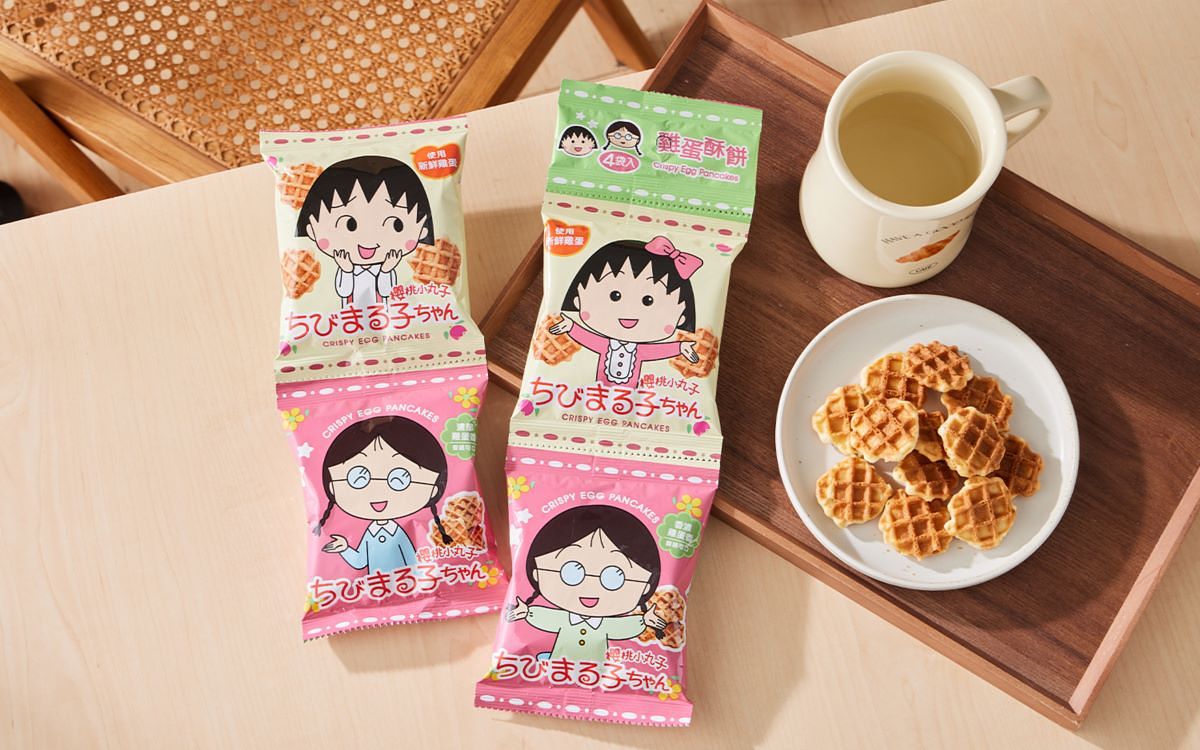 跟小丸子和好朋友小玉一起下課時間吃點心,使用新鮮雞蛋製作的「櫻桃小丸子雞蛋酥餅」同樣是以四小包的串包販售,把歐式鬆餅變成酥脆的餅乾,每一包都可以品嚐到酥脆可口的香濃蛋香。
